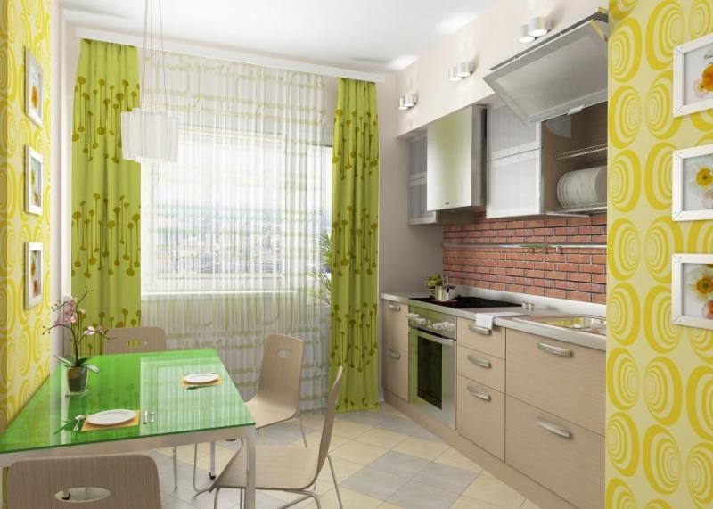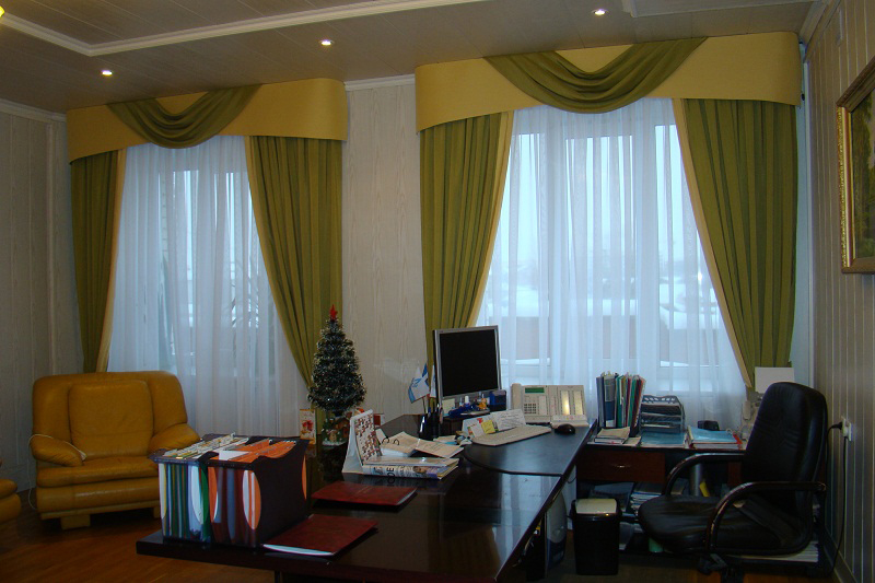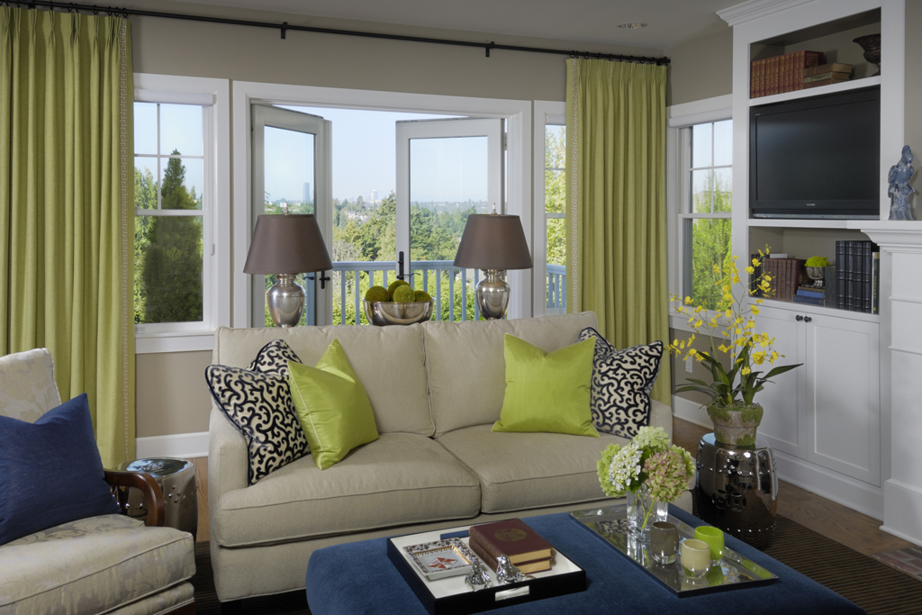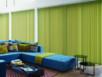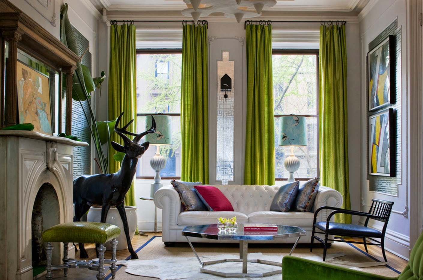 L'ombre vert clair améliore visuellement la pièce. La couleur de chaux extravagante, au contraire, est utilisée dans les grandes salles. La couleur verte, proche de la couleur jaune vif dans la palette conduit à l'action. Le ton bleu-vert des rideaux, au contraire, calme la psyché. Et les rideaux de couleur olive favorisent la concentration.