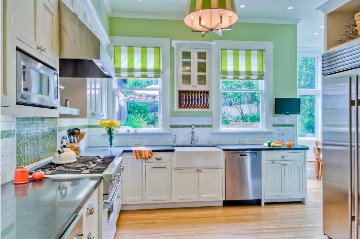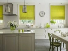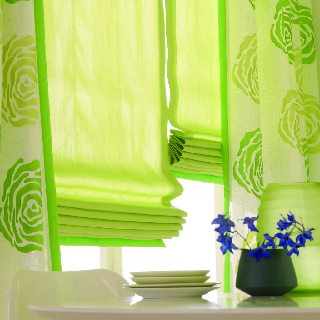 - Cuisine Différents rideaux verts aux tons pastel calmeront l’atmosphère et vous éviteront de trop manger. Mais le vert avec une prédominance de teinte jaune, au contraire, ajoutera de l'énergie et ouvrira l'appétit. Des rideaux courts généralement compacts sont suspendus dans la cuisine en raison de la petite taille de la pièce. Par exemple, des stores romains verts avec un motif seront une bonne option.