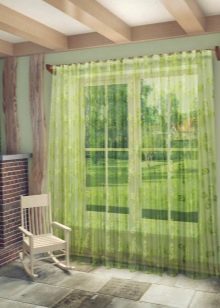 - Style provençal se manifeste dans la décoration des lieux avec des ornements floraux. Les rideaux de lin avec un ornement vert fin donneront une salle de simplicité et de légèreté caractéristiques de cette direction, et la couleur atténuée du vert menthe en tulle dissipera doucement et doucement le soleil.