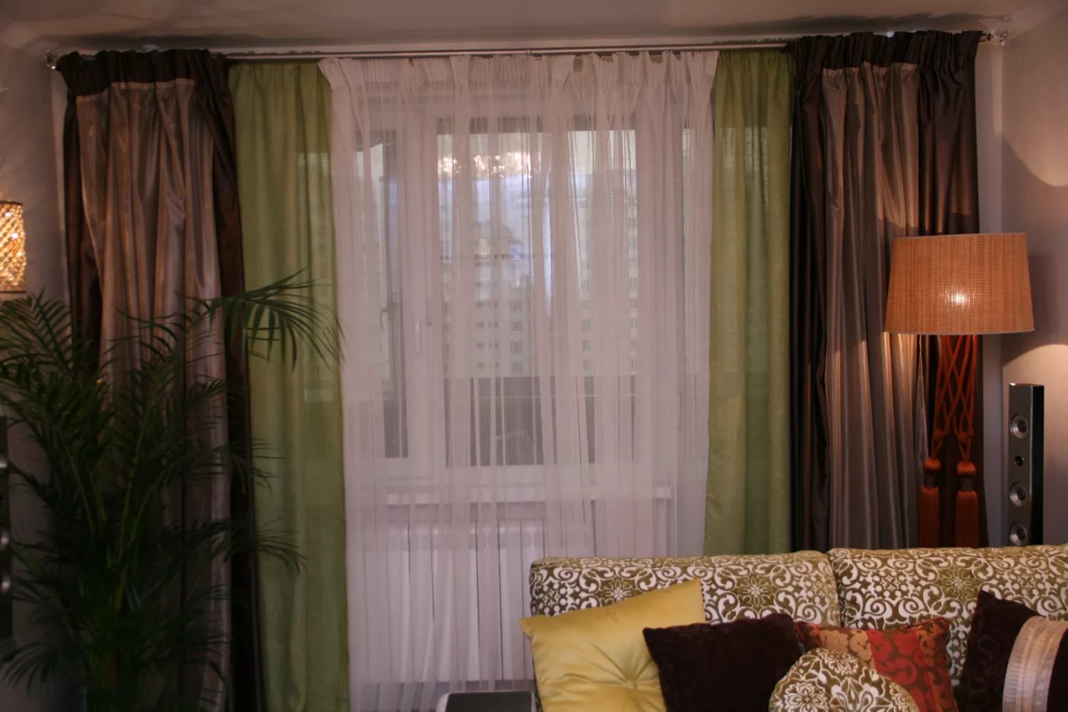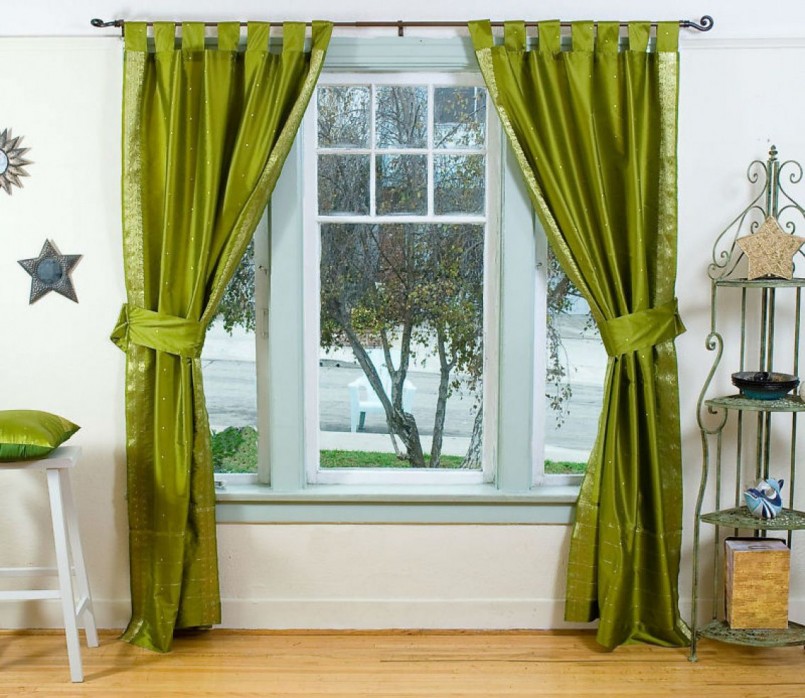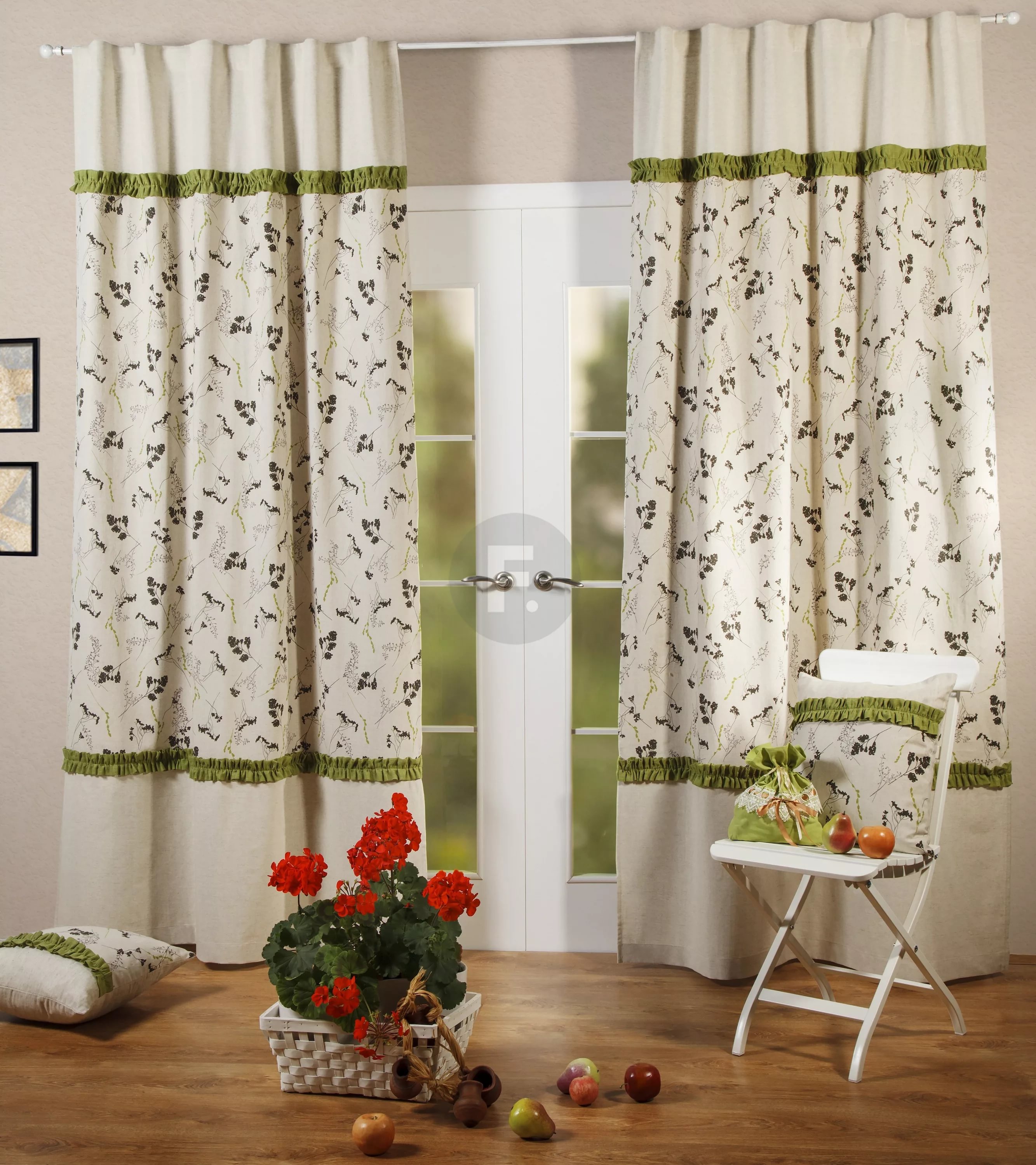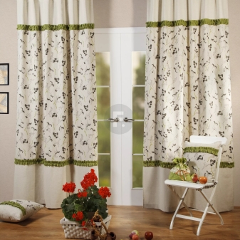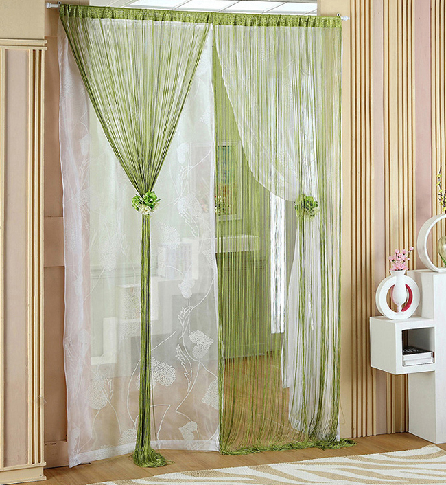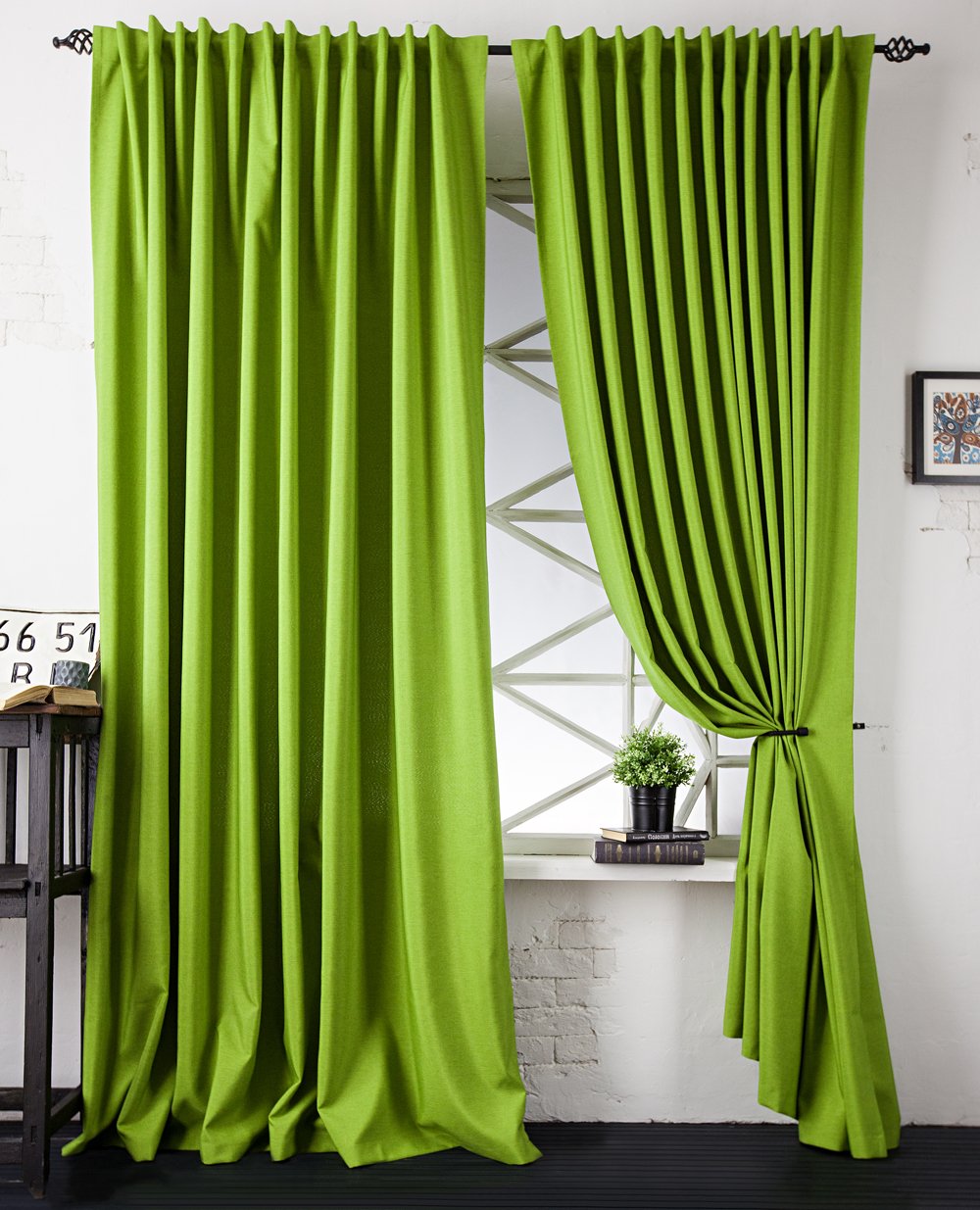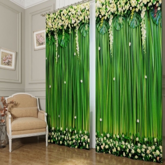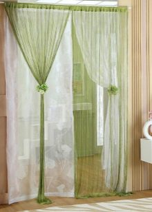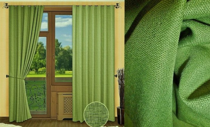 - lin - le matériau naturel le plus célèbre et populaire. Les technologies modernes permettent de teindre les tissus en vert sans perdre ses qualités positives. Ces rideaux sont faciles à laver, n'électrisent pas, diffusent doucement la lumière. Cependant, ils sont difficiles à repasser et ils peuvent "s'asseoir" lorsqu'ils se lavent;