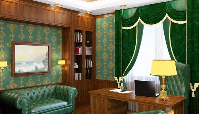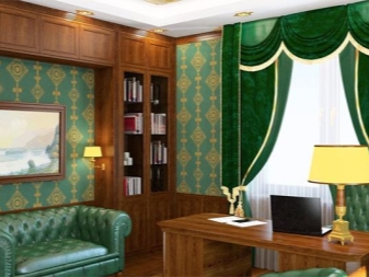 - Cabinet La couleur verte dans l'environnement de travail aide à se concentrer et à prendre une décision. Les tons émeraude et malachite combinés à des couleurs or et marron seront plus beaux ici. Ils vont rendre le commerce intérieur et solide.