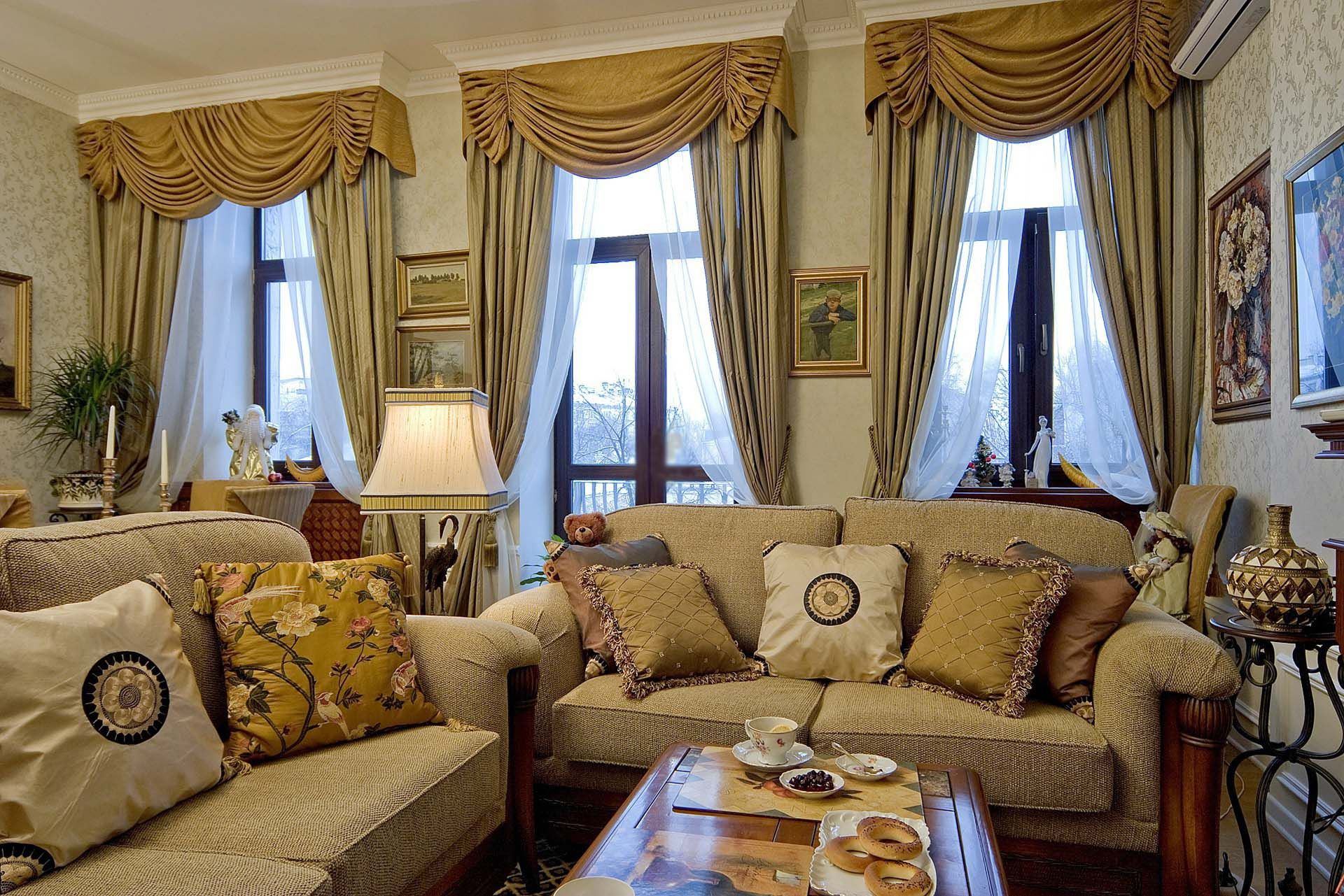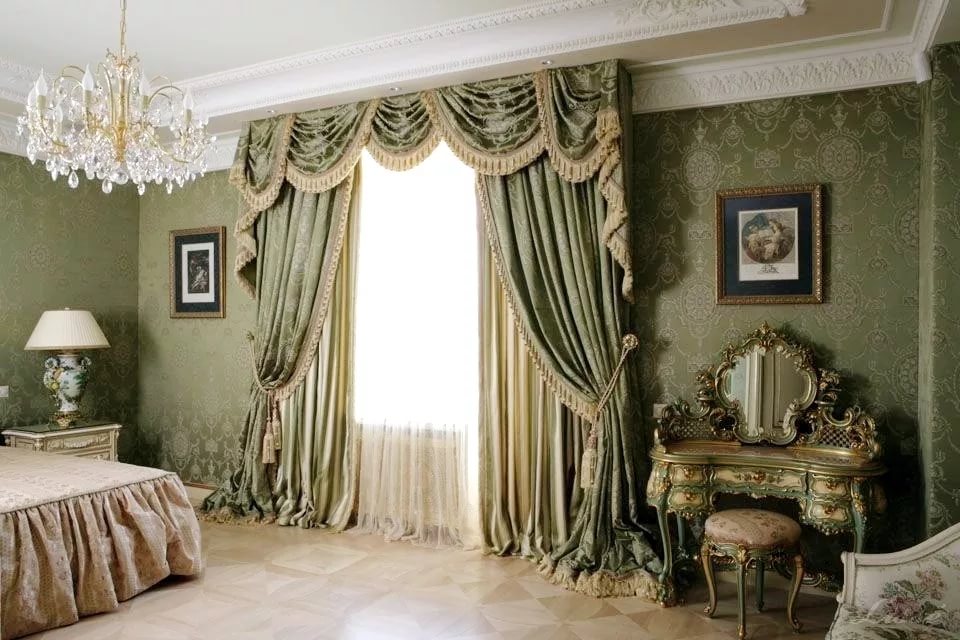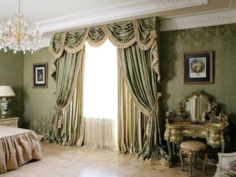 - Style classique implique un cadre luxueux et majestueux. Il utilise la couleur de l'or, du bois et de l'ambre, en harmonie avec les couleurs émeraude, olive et jade. L'ouverture de la fenêtre est autorisée pour les rideaux lourds avec lambrequins et grappins. Les rideaux chics vert foncé s’adaptent aux meubles dorés avec un rembourrage foncé.