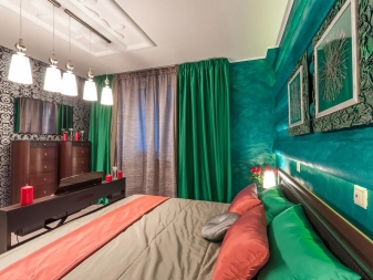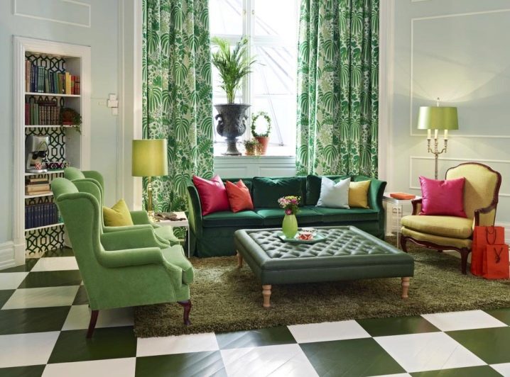 Les rideaux verts à l'intérieur auront l'air appropriés s'ils ont un support de couleur. La couleur peut être complètement dupliquée, par exemple sur du papier peint, des tapis, des lustres ou avoir des teintes différentes. Bien entendu, la pièce ne peut pas être peinte sur le même ton. À cet égard, choisissez quelques couleurs de base de la situation.