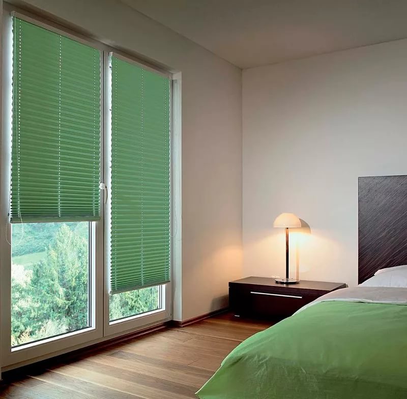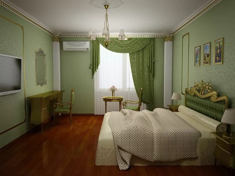 - La chambre La couleur verte est parfaite dans la chambre à coucher. Les rideaux de nuit vert foncé peuvent être combinés avec du tulle clair blanc. Cette combinaison a un effet positif sur le sommeil. L'ombre de jade sur une toile opaque apaise les yeux et la couleur du thé vert convient aux rideaux de jour.