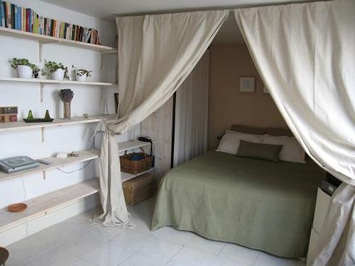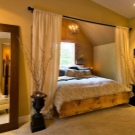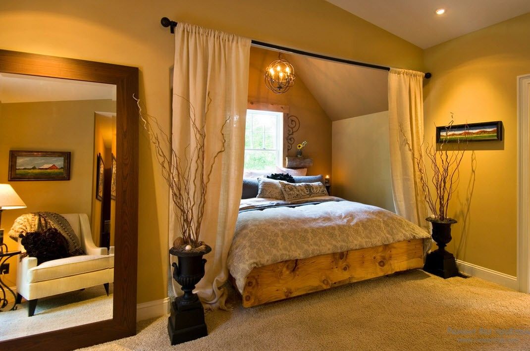 Selon l’intérieur de la pièce, les rideaux de zonage peuvent être complétés par un auvent ou un auvent. Ces conceptions aideront non seulement à zoner l’espace, mais également à protéger celle-ci de la pénétration des rayons lumineux du soleil. Si le choix s'est porté sur l'installation d'un auvent, celui-ci doit être suspendu en tenant compte de l'emplacement du lit, car l'avant-toit ne doit pas obstruer la vue générale de la pièce.