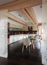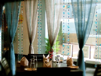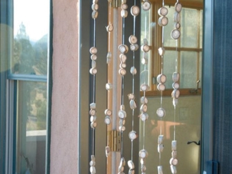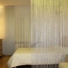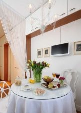 En tant que belle partition, les concepteurs recommandent de zoner la pièce avec des rideaux de perles. C’est une option vraiment originale pour la chambre à coucher, pour laquelle il est préférable de choisir des teintes noir mat, nacre ou apaisantes. De telles cloisons s'intègrent bien à l'intérieur de la cuisine, elles aideront non seulement à diviser l'espace, mais également à clôturer la zone du balcon après l'installation de la voûte.
