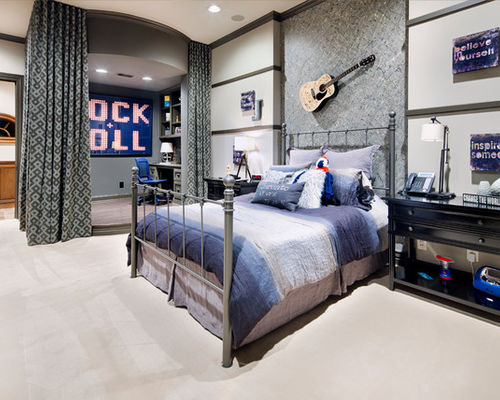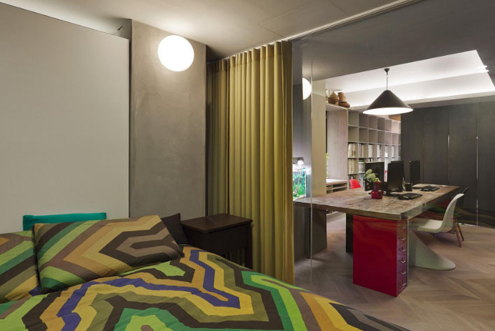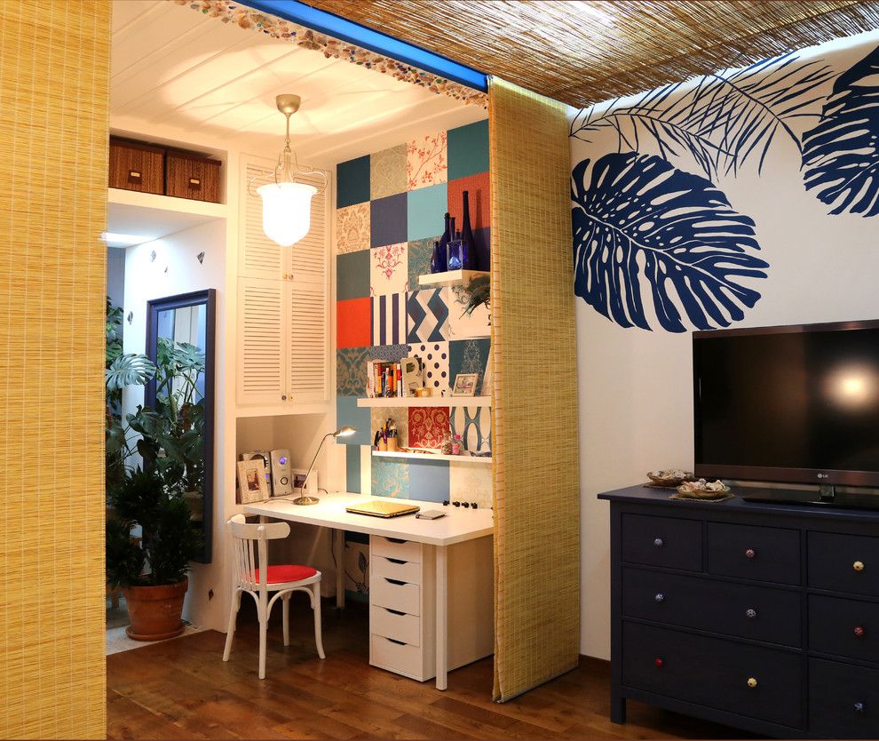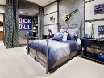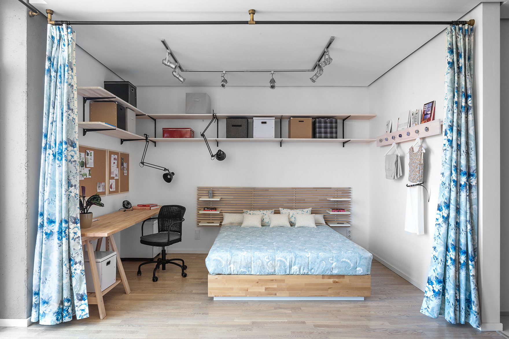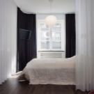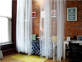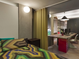 Grâce à cette répartition de l'espace, même dans la plus petite pièce, vous pouvez à l'origine allouer un espace de travail, un espace pour dormir et même installer un coin cuisine. Le zonage des chambres pour les familles avec enfants de différents sexes est particulièrement pertinent et il n'y a qu'un seul enfant dans la maison. Dans cette situation, les rideaux deviendront non seulement un bel élément de décor, mais contribueront également à masquer les étagères, diviseront visuellement la pièce en deux et transformeront un petit espace en une île confortable.