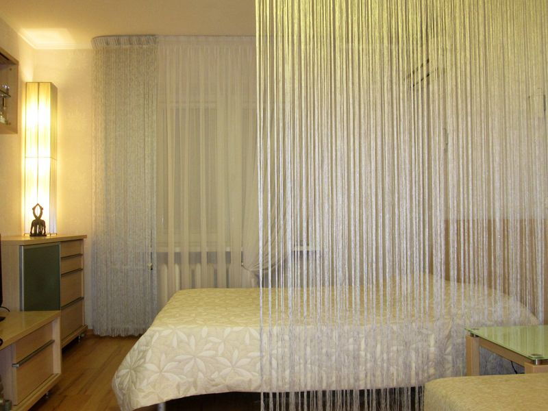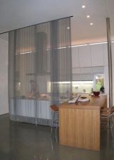- Forme de séparation peu coûteuse et abordable. Contrairement aux autres méthodes de zonage, les rideaux sont une option économique. Ils sont facilement sélectionnables en taille et s'intègrent harmonieusement dans n'importe quel intérieur de pièce.