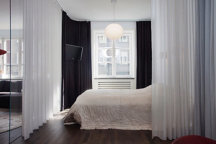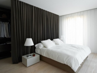 Pour les connaisseurs de minimalisme et d’approche moderne en matière de conception, il est considéré comme pertinent de diviser une pièce à l’aide de types classiques de rideaux en tissu. Ils isoleront facilement le lit dans la niche et diviseront la chambre en deux pendant le repos nocturne, et disparaîtront rapidement pendant la journée. À cette fin, il est recommandé d'utiliser des rideaux bilatéraux qui remplaceront le mur des deux côtés de la pièce. Dans le même temps, il est préférable d’installer des toiles denses de couleurs pastel dans la zone de loisirs. Au revers, privilégiez les tissus les plus élégants et les plus vifs, avec des motifs typiques du salon.