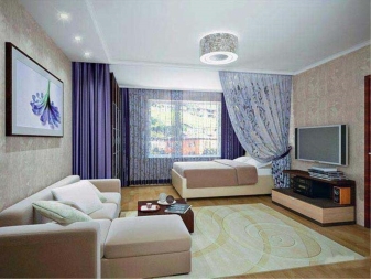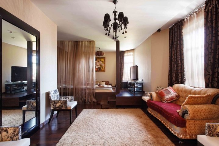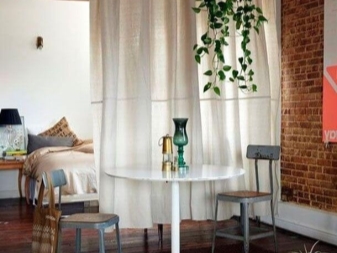 Il est possible de diviser la pièce en segments à l'aide de rideaux en divers textiles. Les plus populaires aujourd’hui sont les rideaux de taffetas et de jacquard. De plus, les tissus denses seraient bien complétés par des matériaux plus légers.Le découpage des toiles doit prolonger l’intérieur général de la pièce et s’harmoniser avec le style de la pièce.
