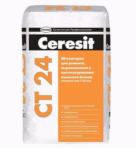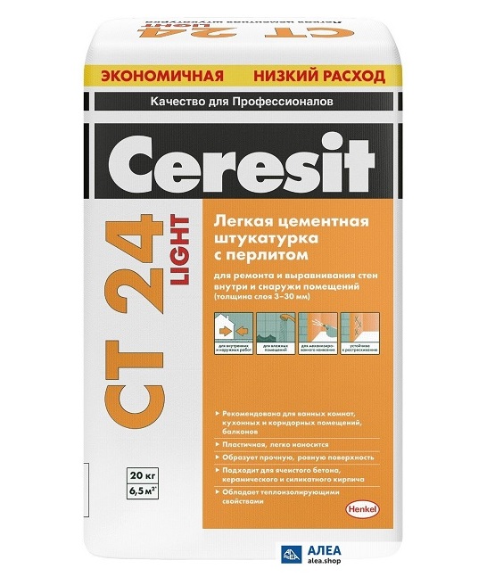 - CT-24 Light - le revêtement de nivellement facile de couleur claire. Avantages - résistance au gel, absence de fissures et excellentes qualités d'isolation thermique.