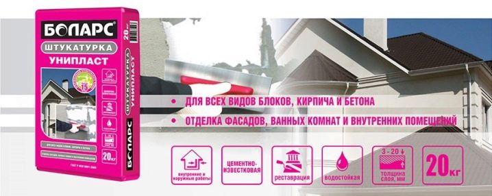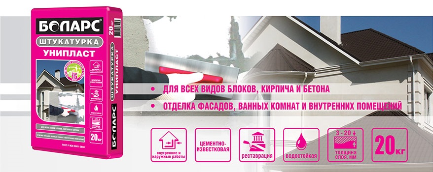 - Uniplast - matériau à haute perméabilité à la vapeur. Convient pour l'extérieur, la finition intérieure et appliqué manuellement.
