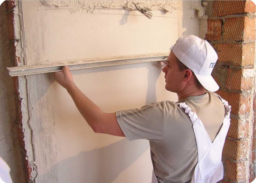Beaucoup de maîtres font des murs de plâtre sans l'utilisation de balises. Cette méthode convient le plus souvent aux surfaces présentant des défauts mineurs et si vous n’avez qu’à couper la base sous la couche décorative. Dans ce cas, déterminez l'écart du plan par rapport au niveau souhaité.. Ceci est fait en utilisant la règle qui est pressée contre le mur.
