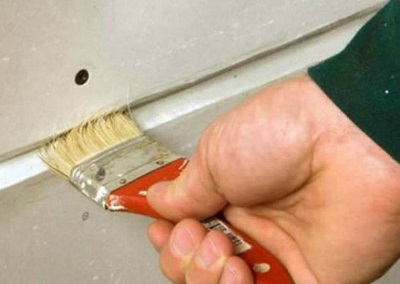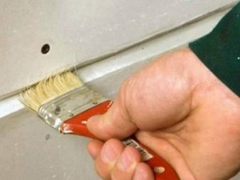 Avant d'utiliser du plâtre, il est préférable de traiter la base avec un apprêt à pénétration profonde. L'apprêt doit être appliqué uniformément en couche mince avec un rouleau ou un pinceau. Avant de choisir un apprêt, assurez-vous d’étudier sa composition, elle devrait convenir aux cloisons sèches. Après vous devez coller sur les coutures avec un ruban de renforcement spécial.
