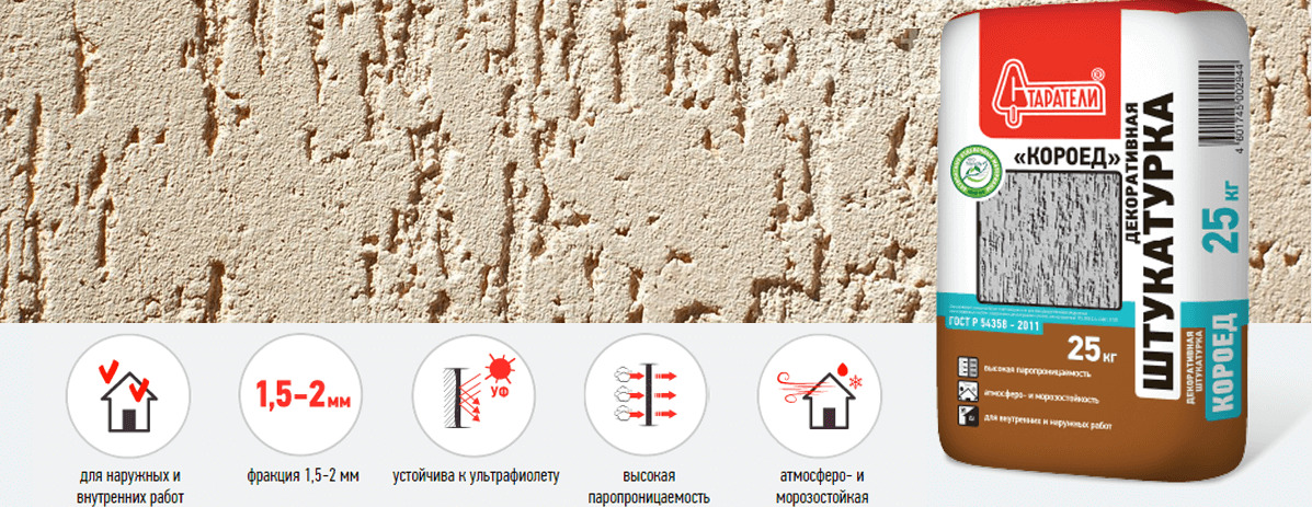 En cas de travaux, des exigences de résistance accrues sont imposées au plâtre pour scolytes. Premièrement, la composition doit résister aux conditions météorologiques: exposition à long terme au rayonnement ultraviolet, aux variations de température, à la saison des pluies ou à la neige. Deuxièmement, il est important que le plâtre résiste aux coups de pluie ou de grêle. Troisièmement, les caractéristiques d'isolation thermique ne sont pas à la dernière place. Quatrièmement, le «scolyte» doit conserver longtemps son aspect d’origine.