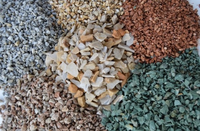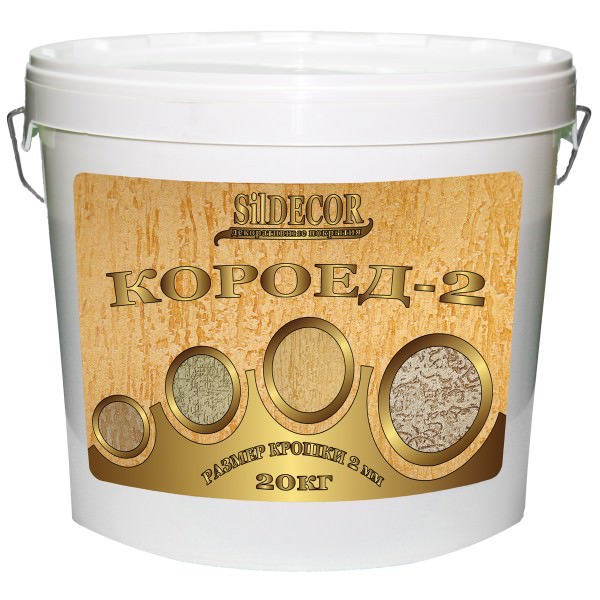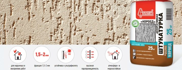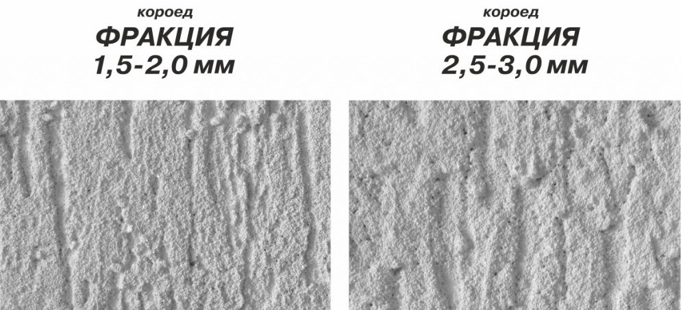 Les "scolytes" peuvent avoir des taches de différentes fractions - de 0,8 à 3,5 mm. Cela dépend de ce à quoi la composition est destinée - extérieur ou intérieur. Au fait L'universalité de la composition réside précisément dans la possibilité d'utilisation polyvalente: ces murs ont l’air beau à la fois sur la façade et à l’intérieur de la pièce.