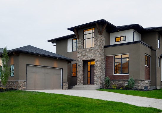 Chalet de campagne, dont la façade est confrontée à une combinaison de "scolyte" et de fausse brique, a l'air moderne et solide.