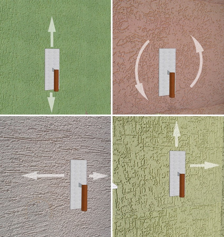 En ce qui concerne la conception, à l'aide de cet enduit, il est possible d'obtenir différents effets s'il est appliqué avec différents outils: arrondi pour “agneau”, mouvements de haut en bas pour “pluie”, etc. Il y a beaucoup d'options, il est seulement important de comprendre ce que vous voulez réaliser à la fin. Voici deux techniques différentes: