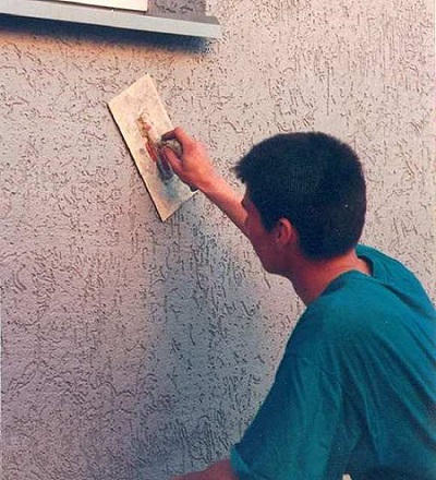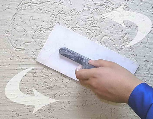 Si la méthode manuelle est choisie, décidez d'abord de la manière dont le plâtrage se déroulera: manière bezmajachny ou par balises. Lors de l’installation des balises, il faudra plus de composition, donc si les murs sont relativement plats, il vaut mieux les abandonner. Le dessin est fait de bas en haut. La solution est précipitée à la surface, puis nivelée. La technologie d'application d'une couche brute ne diffère pas du travail avec tout autre enduit décoratif.
