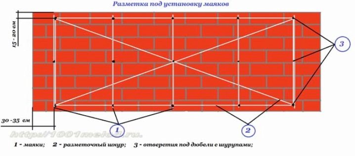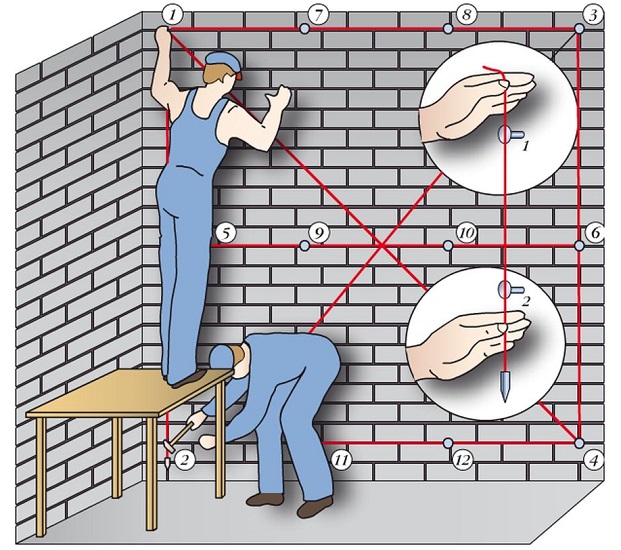 Lorsque vous marquez la surface près du sol et des vis de plafond.Avant d'installer les balises, il est nécessaire de vérifier à nouveau et de vérifier la verticalité des lignes obtenues à l'aide d'un fil à plomb. En cours de marquage, il est nécessaire de tendre les cordes de guidage verticalement, horizontalement et en diagonale. Sous chacun d'eux, vous devez tenir un profil de balise. Si les phares s'accrochent au niveau, les vis doivent être réinstallées.