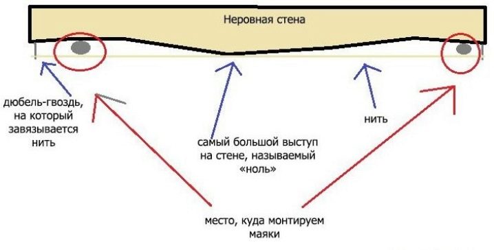 L'installation des balises ne peut être effectuée qu'après le séchage de la couche de sol. Pour niveler les surfaces horizontales ou verticales, vous devez ajuster l'épaisseur de la couche de plâtre. Cela est particulièrement vrai avec des irrégularités importantes.Pour ce faire, utilisez des balises.