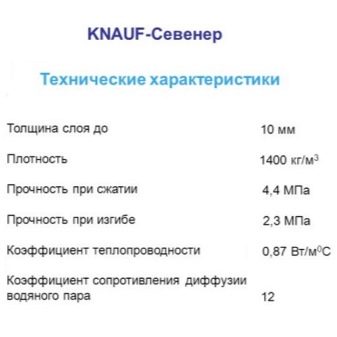 Pour la fabrication du produit, les professionnels Knauf Sevener ont utilisé des impuretés et des additifs spéciaux. Ils fournissent un excellent indicateur d'adhérence, de propriétés hydrofuges, de résistance à l'usure et de résistance à la fissuration. Ces caractéristiques sont maintenues tout au long de la vie.