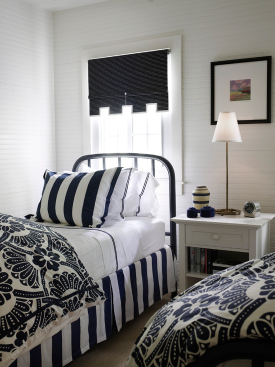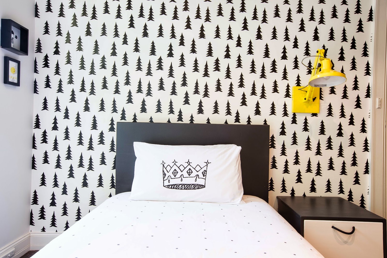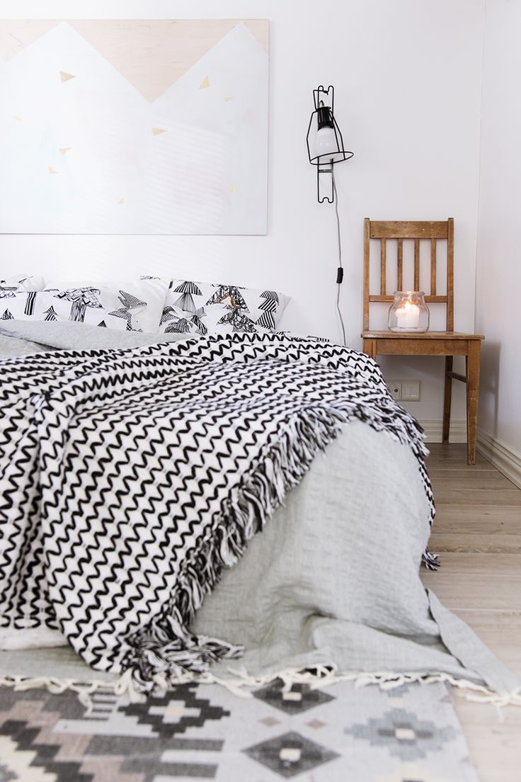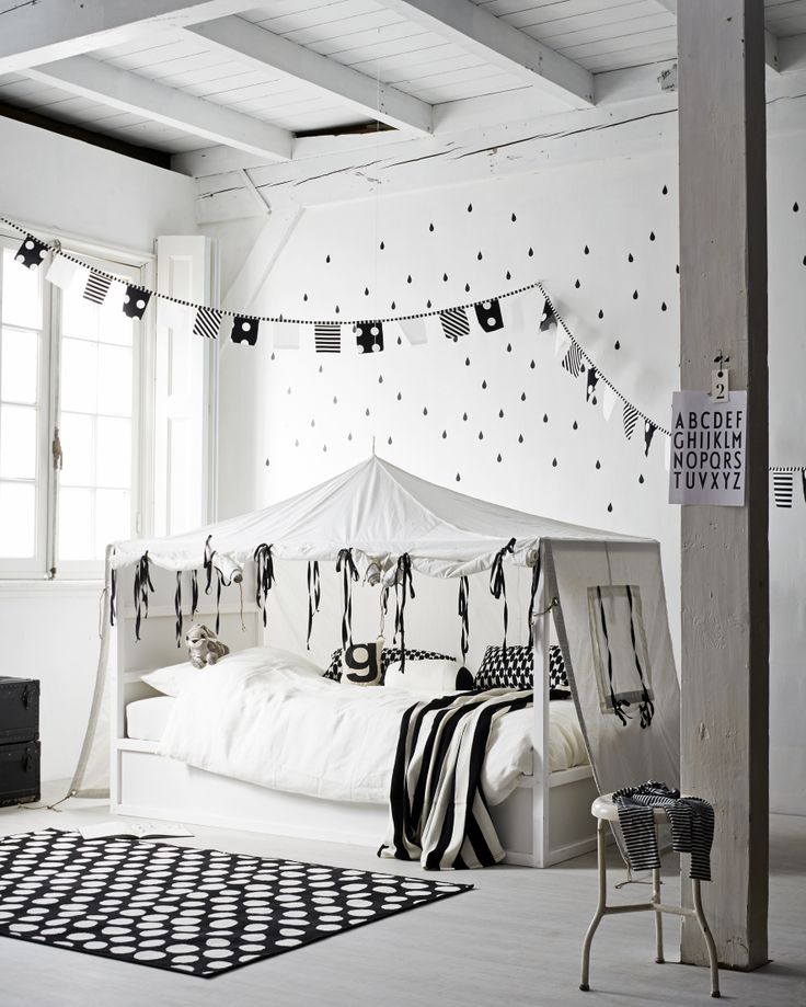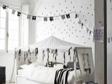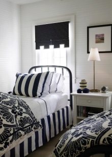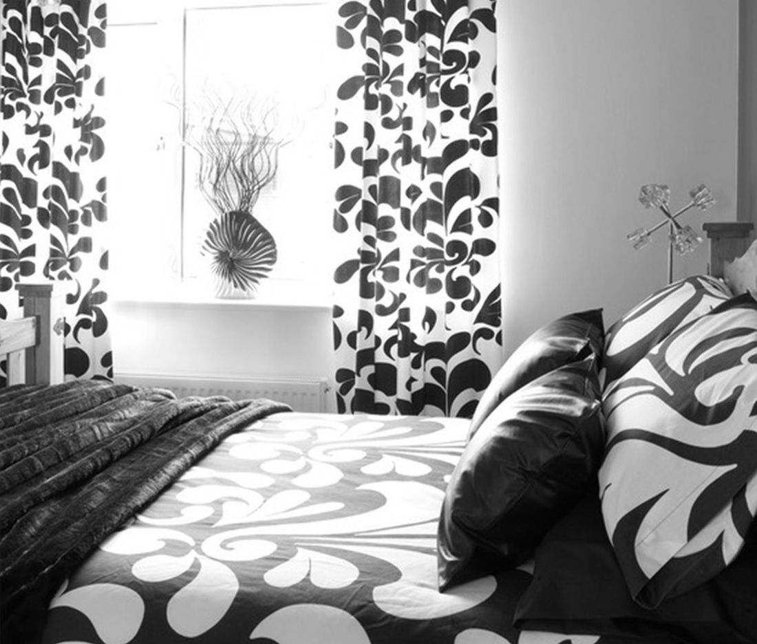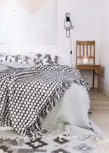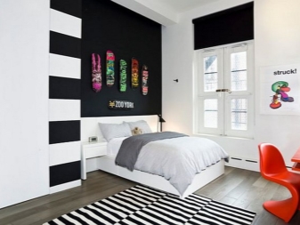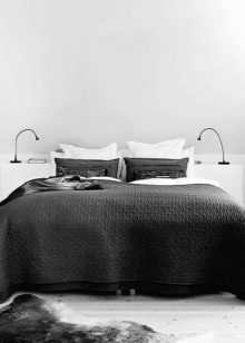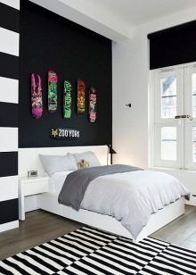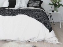 La salle aux deux couleurs opposées ravira les adeptes du minimalisme.Ce style ne signifie pas qu'il soit nécessaire de peindre une partie de la pièce d'une couleur et l'autre d'une autre et d'installer des meubles en noir et blanc dans la chambre à coucher. Les motifs blancs avec motifs noirs, lignes et autres motifs sont impressionnants. La même technique peut être répétée sur des meubles et des matériaux textiles.