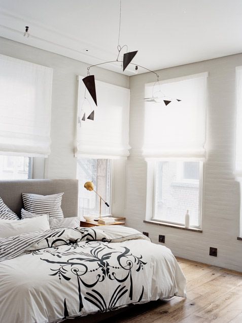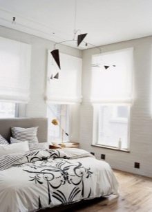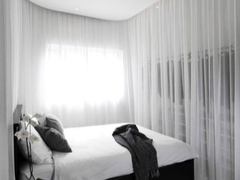 Si la chambre à coucher a de grandes fenêtres et un panorama coloré, vous ne pouvez jamais les pendre du tout ou utiliser du tulle clair comme décoration de fenêtre.