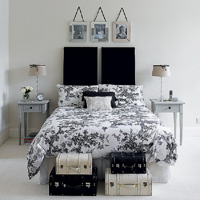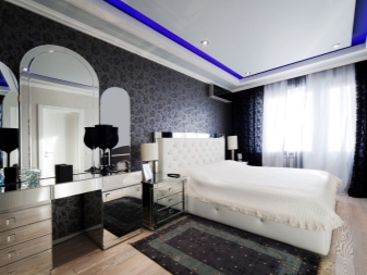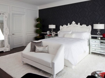 La chambre noire et blanche a fière allure. Baroque et Rococo, si vous choisissez le bon mobilier. La décoration exquise sera un grand lustre, encadré par des lumières transparentes ou noires. Vous pouvez utiliser des chandeliers en métal, des vases de fantaisie, des cadres, de la peinture dorée ou argentée, etc. comme décoration.