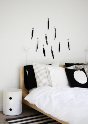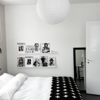 L'ajout de couleur est souvent introduit à l'intérieur comme matériau textile: oreillers, nappes, rideaux, linge de lit, couvertures, etc.Il peut également s'agir d'objets de décoration, tels que des photographies, des peintures, des vases, des figurines. Dans ce cas, il est important de sentir la mesure afin de ne pas détruire la combinaison des couleurs noir et blanc.