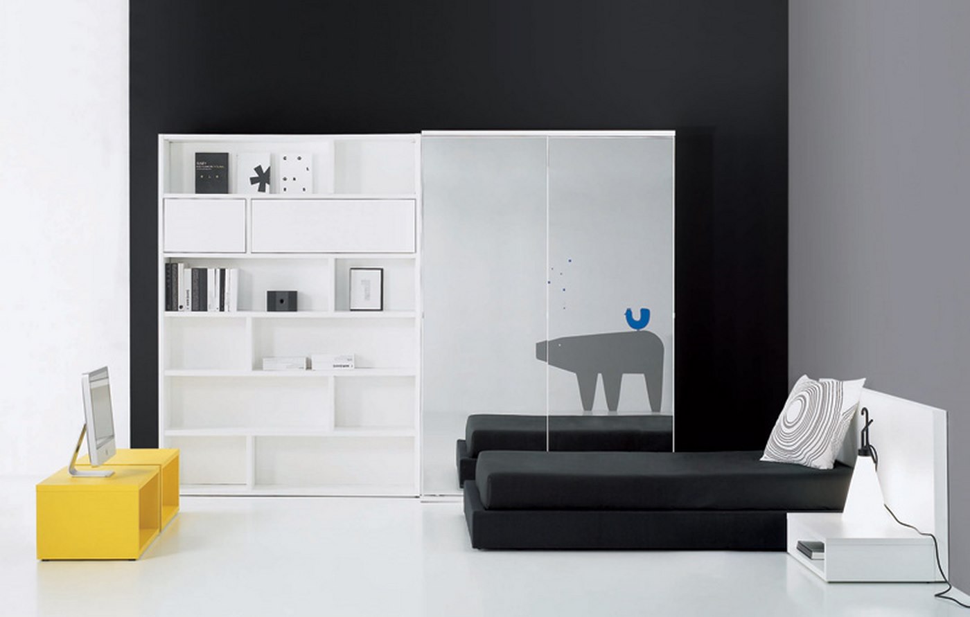 Deux couleurs strictes auront fière allure dans minimalisme. Mobilier minimum, sans fioritures. Seulement rigueur, simplicité, brièveté. Cette conception soulagera la fatigue et mettra en place un repos approprié. Deux couleurs suffisent pour aménager tous les locaux, meubles et accessoires compris.