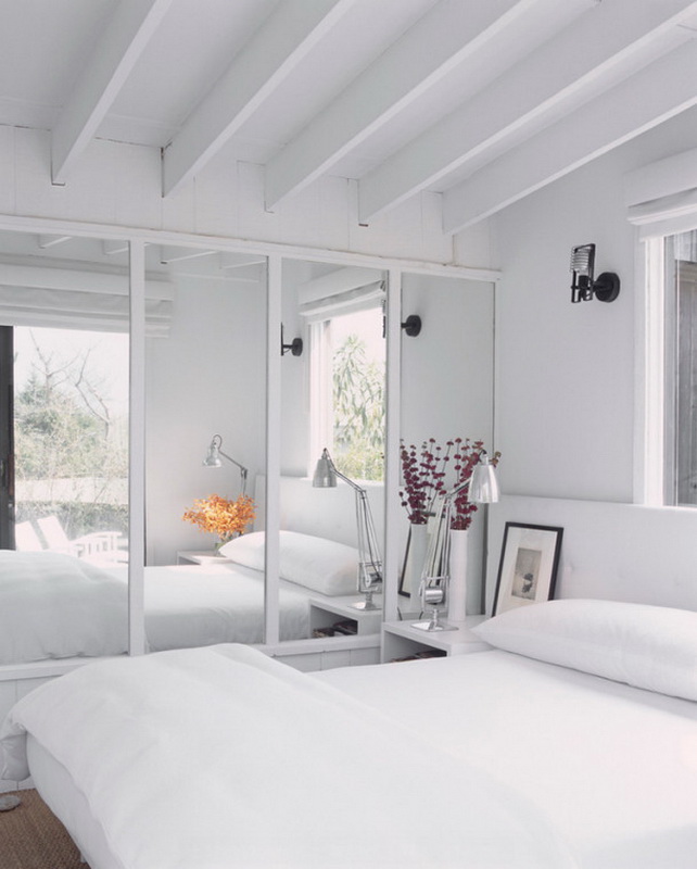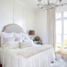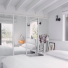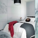 - Chambre blanche. Le gamma blanc est utilisé à l'intérieur, les textiles sont un accessoire contrastant. Le but de la chambre uniquement pour dormir déterminait la composition du mobilier. Sur une superficie de 9 mètres carrés. M. Il n'y avait pas de place pour les tables de chevet, il serait impossible d'utiliser les armoires. La conception est légère, aérée à cause de la finition blanche ainsi que des systèmes d'éclairage en pointillés. En tant que systèmes de stockage - les baies blanches montent jusqu'au plafond. Le miroir augmente visuellement l'espace de la pièce.