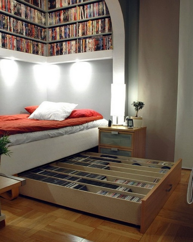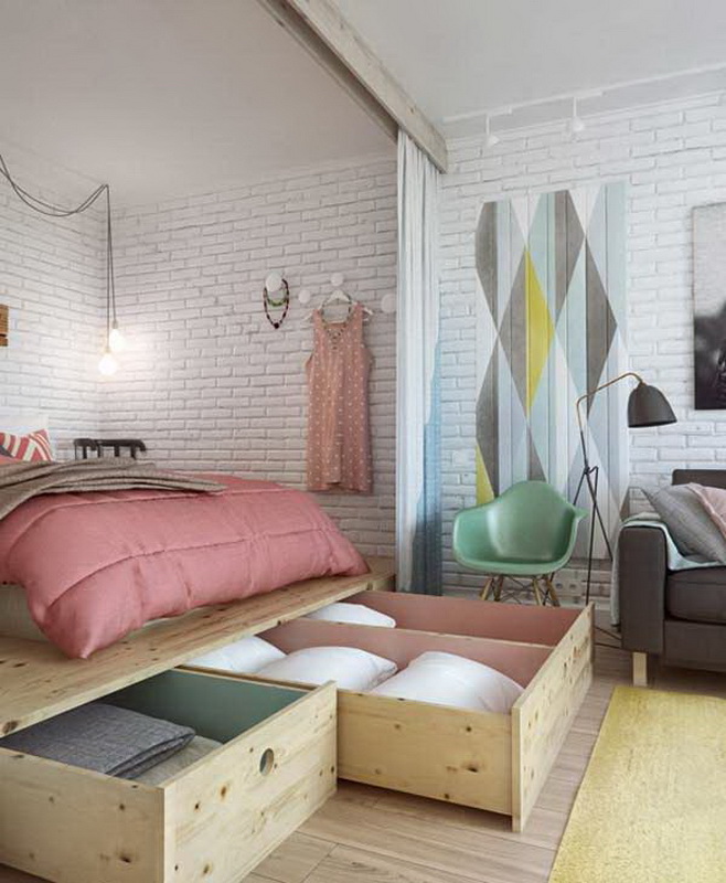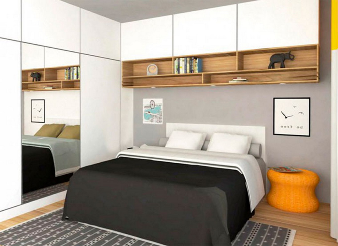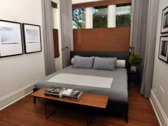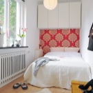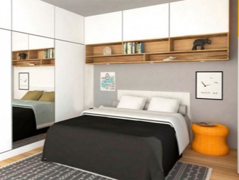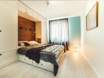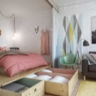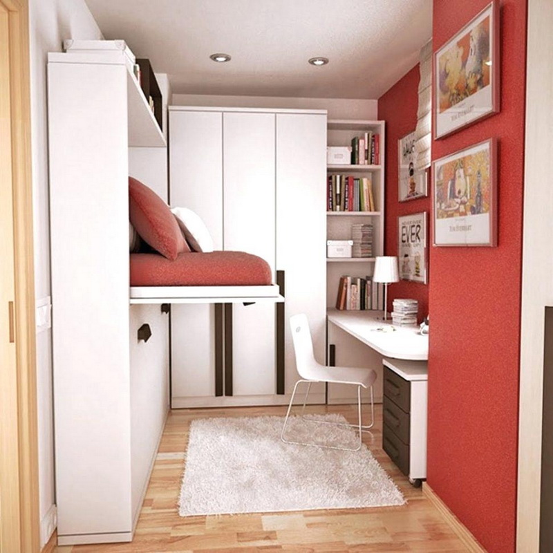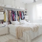 Il arrive souvent qu'une petite chambre ne soit pas équipée d'une armoire à portes battantes. Vous devriez plutôt essayer les portes qui peuvent être ouvertes ou un rideau accordéon. La possibilité de meubles intégrés à l'appareil (armoires, étagères, etc.) permet de gagner de la place dans une petite chambre. Une idée intéressante de stockage de vêtements: accroché avec des choses peuvent être suspendus au plafond ou sur des étagères ouvertes. Parfois, dans le grand lit, il y a un grand espace qui peut être utilisé comme espace de stockage. Cela peut être un système coulissant ou avec un mécanisme de levage.