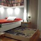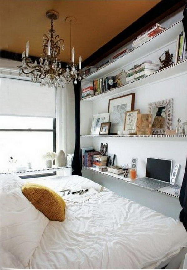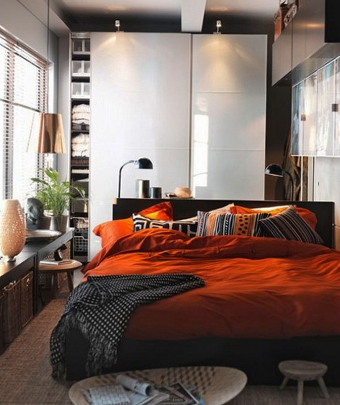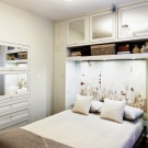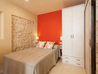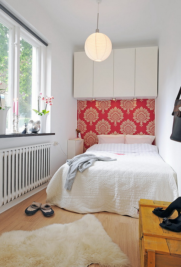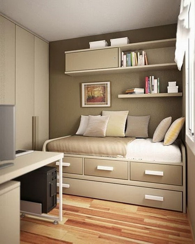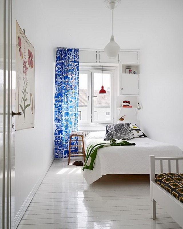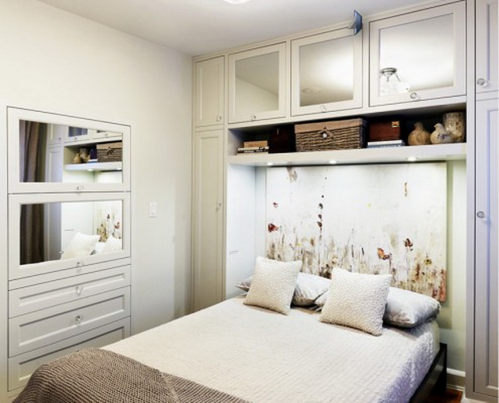 Il arrive souvent qu'une petite chambre ne soit pas équipée d'une armoire à portes battantes. Vous devriez plutôt essayer les portes qui peuvent être ouvertes ou un rideau accordéon. La possibilité de meubles intégrés à l'appareil (armoires, étagères, etc.) permet de gagner de la place dans une petite chambre. Une idée intéressante de stockage de vêtements: accroché avec des choses peuvent être suspendus au plafond ou sur des étagères ouvertes. Parfois, dans le grand lit, il y a un grand espace qui peut être utilisé comme espace de stockage. Cela peut être un système coulissant ou avec un mécanisme de levage.