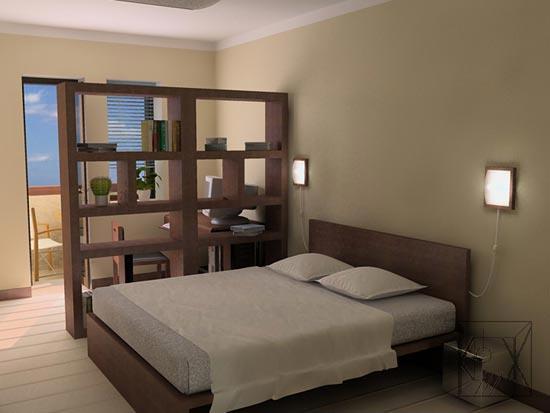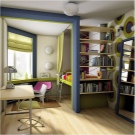 - Textiles ou meubles. Ces zones permettent de séparer une zone de l’autre. Par exemple, le zonage peut être effectué à l'aide d'écrans. Ils ne prendront pas beaucoup de place, vous pouvez les installer facilement et simplement vous-même. Vous pouvez également diviser la pièce avec des meubles. C'est également l'une des options les plus courantes et les plus réussies. Séparez votre bureau avec un bureau, en plaçant par exemple un placard ou une étagère.Laissez-le être même un petit coin, mais c’est là que vous pourrez penser sereinement à des tâches importantes et également mener des activités de travail actives. La règle principale est la confidentialité: lorsque vous travaillez, vous ne devez pas voir le lit. Vous devez disposer de plusieurs zones fonctionnelles dans la même pièce, organiser une chambre et un lieu de travail.