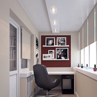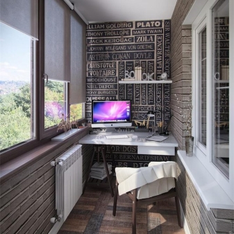 Vous pouvez équiper une loggia en tant que bureau de travail. Séparer la zone réussira comme une porte vitrée et un écran.