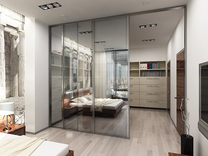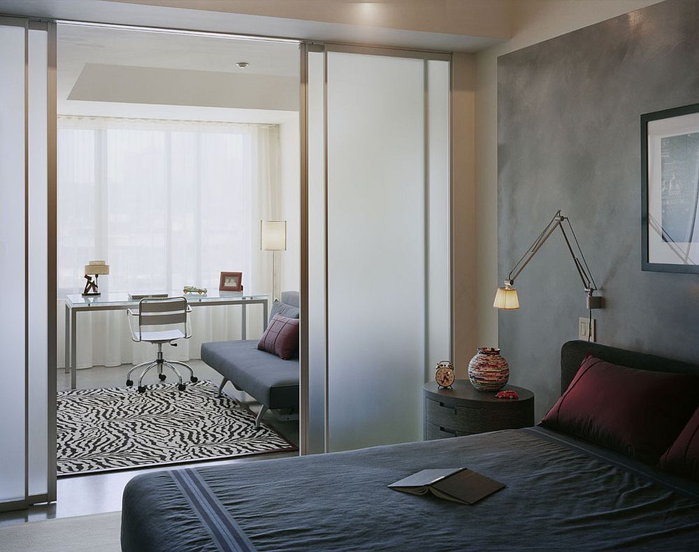 Une chambre plus spacieuse vous permet de créer les options les plus originales. Ici, vous pouvez utiliser avec succès des cloisons et des portes en verre. Ils aideront à allouer discrètement un espace de travail tout en décorant la pièce avec élégance. Dans ce cas, vous pouvez montrer toute votre fantaisie.