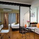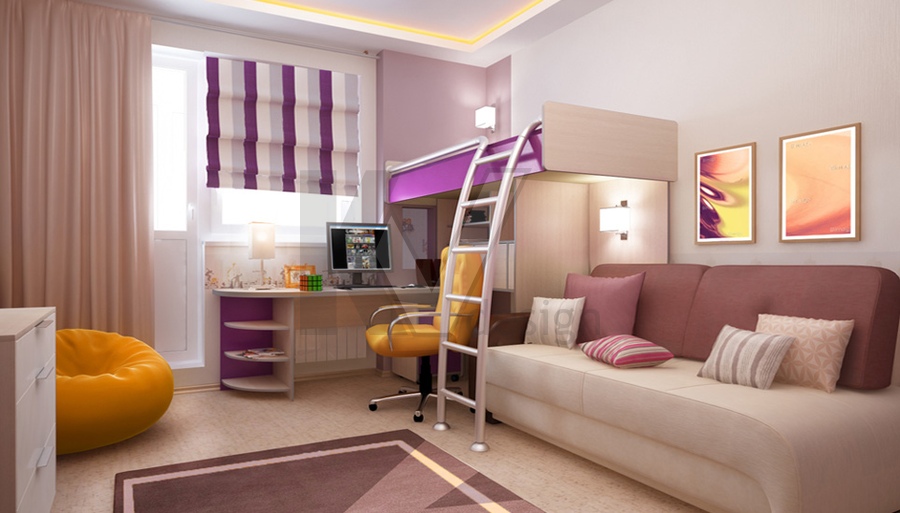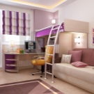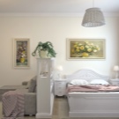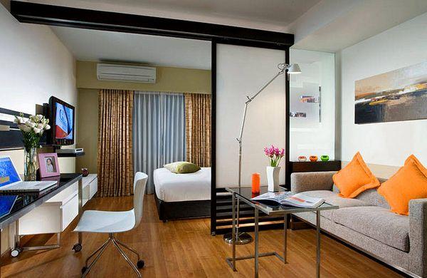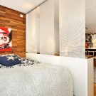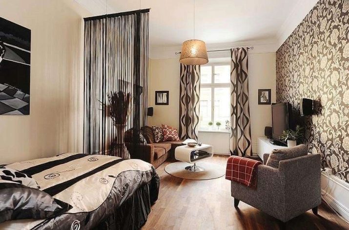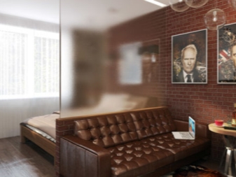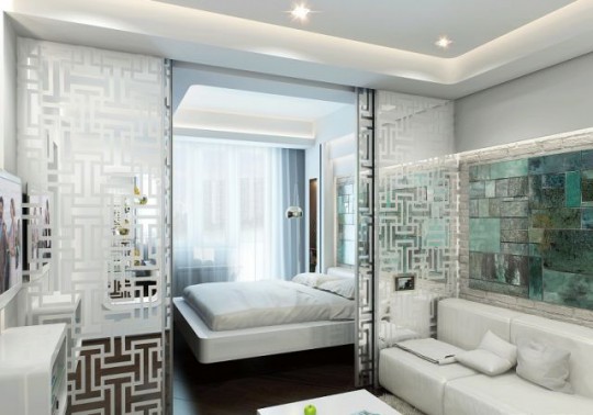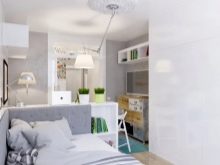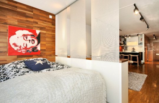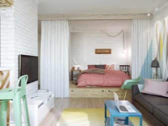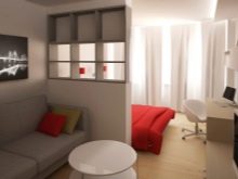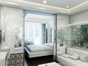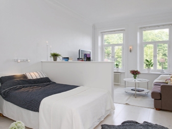 S'il existe un endroit séparé pour dormir, vous devez acheter un lit et une table de chevet. Il est préférable d’avoir un coin nuit loin de la porte de la chambre, plus près de la fenêtre ou du balcon.Cette zone peut être limitée à une partition conditionnelle. Une commode basse pour le rangement d'objets, une étagère peut servir de démarcation de zones. Il peut s’agir d’une petite cloison décorative en verre sur laquelle est appliqué un motif laser.