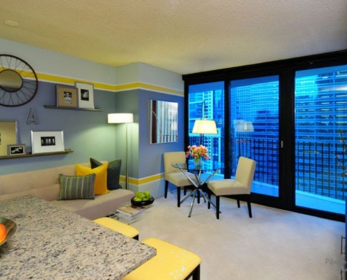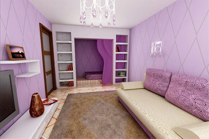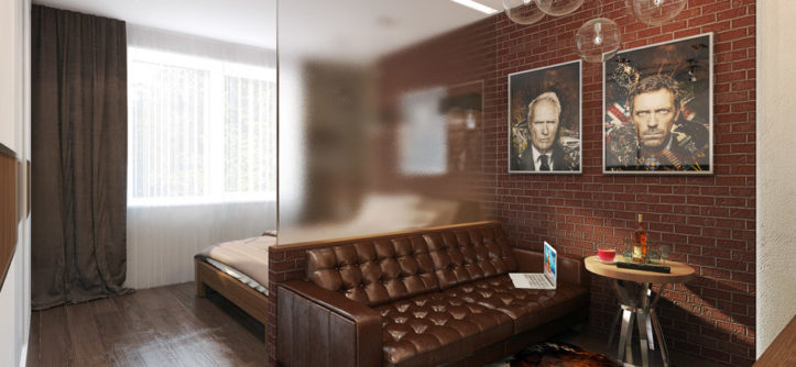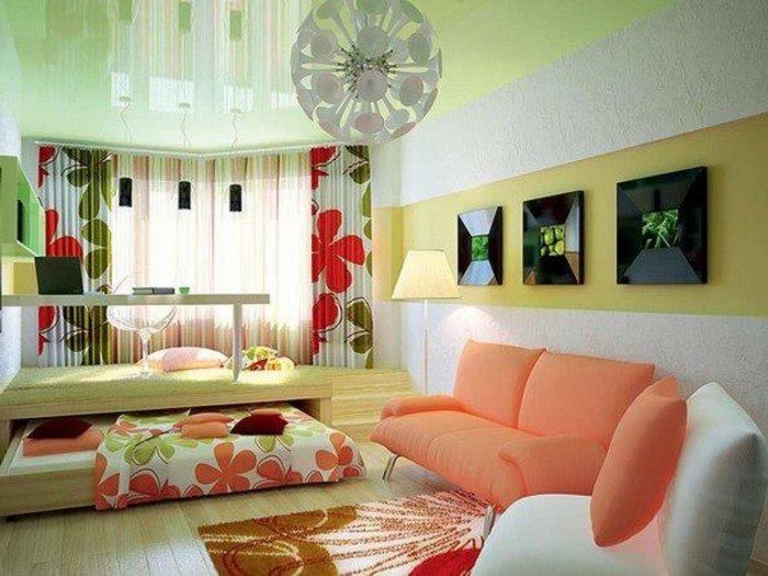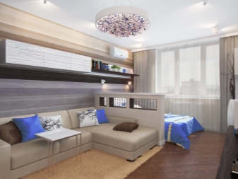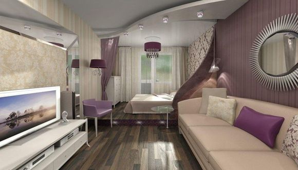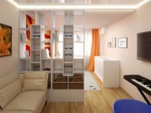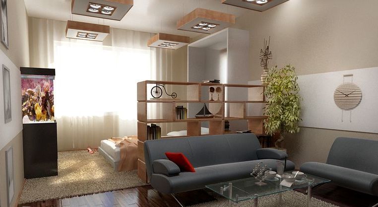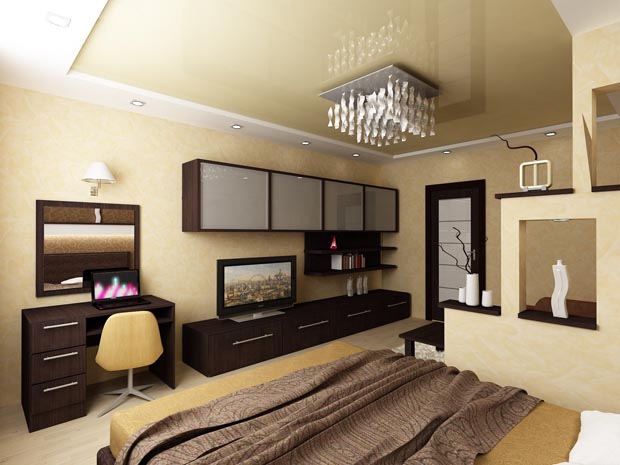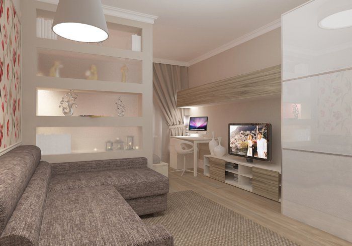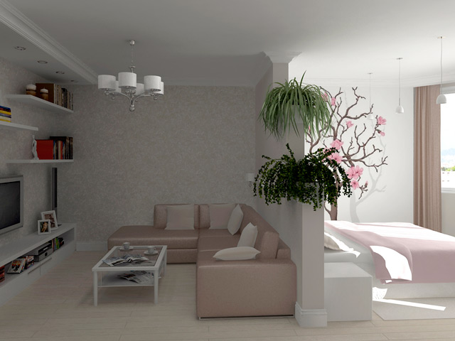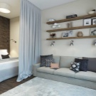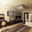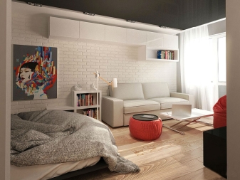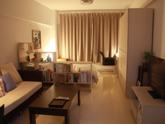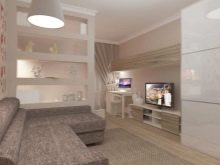 Le salon est idéalement situé avec un canapé, une télévision et un équipement audio, une table basse. Lorsque vous combinez un lit avec un espace de vie, il est important de choisir un canapé qui peut facilement être transformé en un lit confortable et à part entière. Ce sont les meubles de base nécessaires pour une petite chambre-salon. Cette liste peut être complétée, mais il ne faut pas oublier que le mobilier ne doit pas être trop.