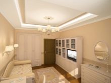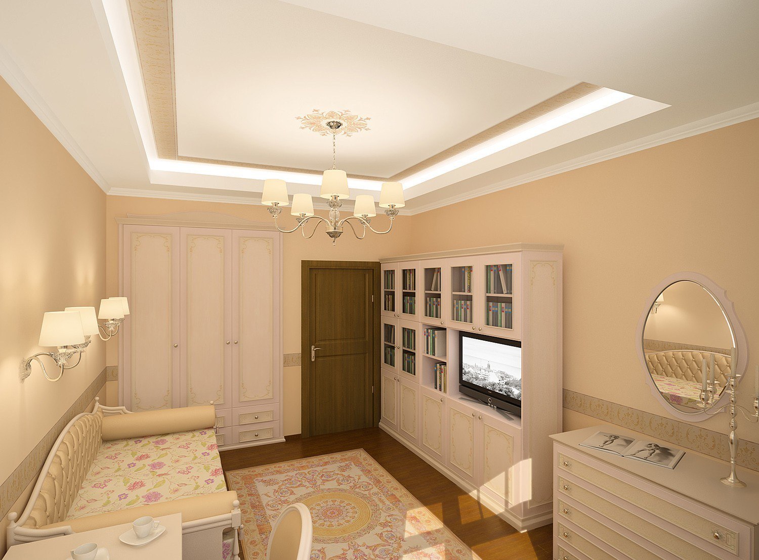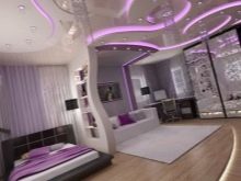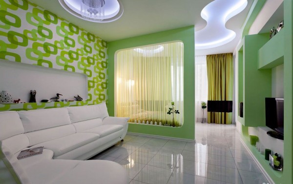 Pour le plafond, il est préférable d'utiliser du blanc ou de l'ivoire. Pour les pièces avec une hauteur de plafond standard, il convient de refuser les formes complexes et les baisses de niveau. La surface du plafond doit être plane et lisse, sans irrégularités, éclats et affaissement. Les défauts et les défauts du plafond sont très bien visibles, et l'éclairage artificiel ne fera que les souligner davantage. Si la pièce présente de grandes différences dans les joints des plaques, il est préférable de fermer le plafond avec des plaques de plâtre. Une autre solution belle et pratique serait un plafond tendu blanc brillant. Cela rendra visuellement la hauteur de la pièce plus grande, l’espace est plus clair. Il est facile à maintenir et à l'épreuve du feu.