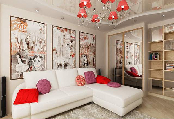 Les miroirs, les peintures, les affiches, les plantes vivantes et les objets d’art appliqué constituent un autre décor. Choisis avec soin dans le style général de la salle, bien placés et suspendus, ils sont en mesure de créer un paradis pour un séjour harmonieux et confortable dans un petit espace.