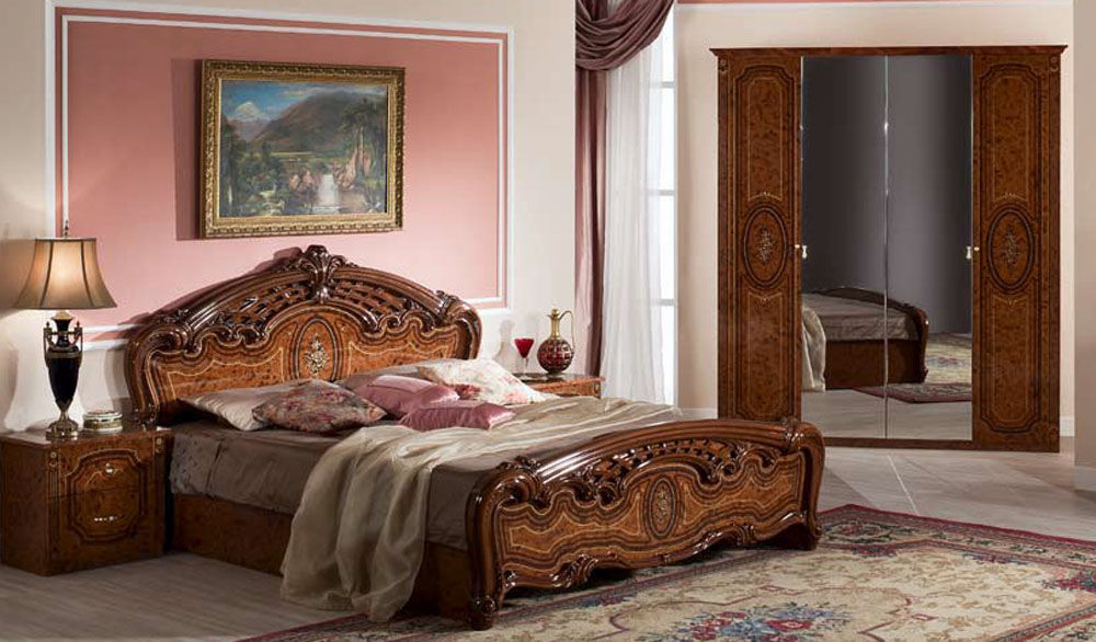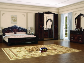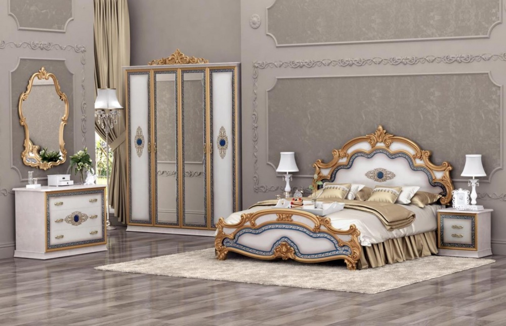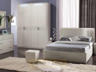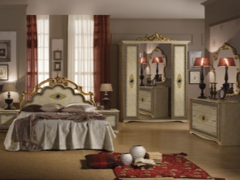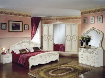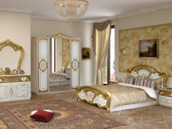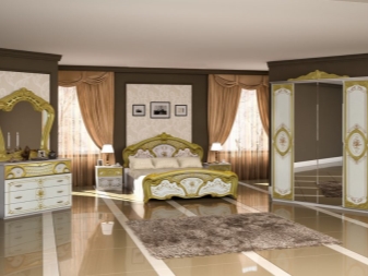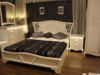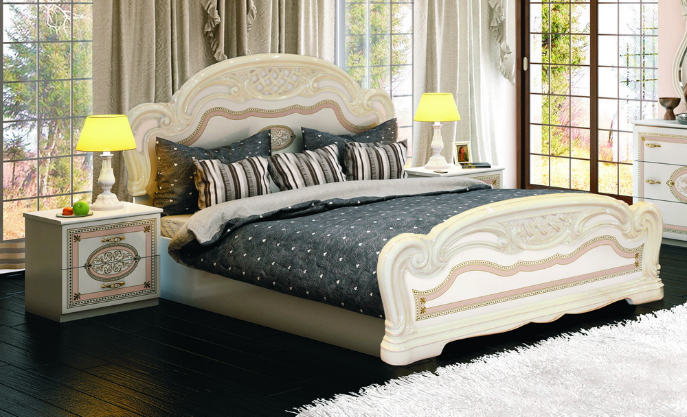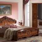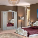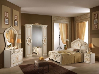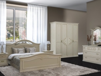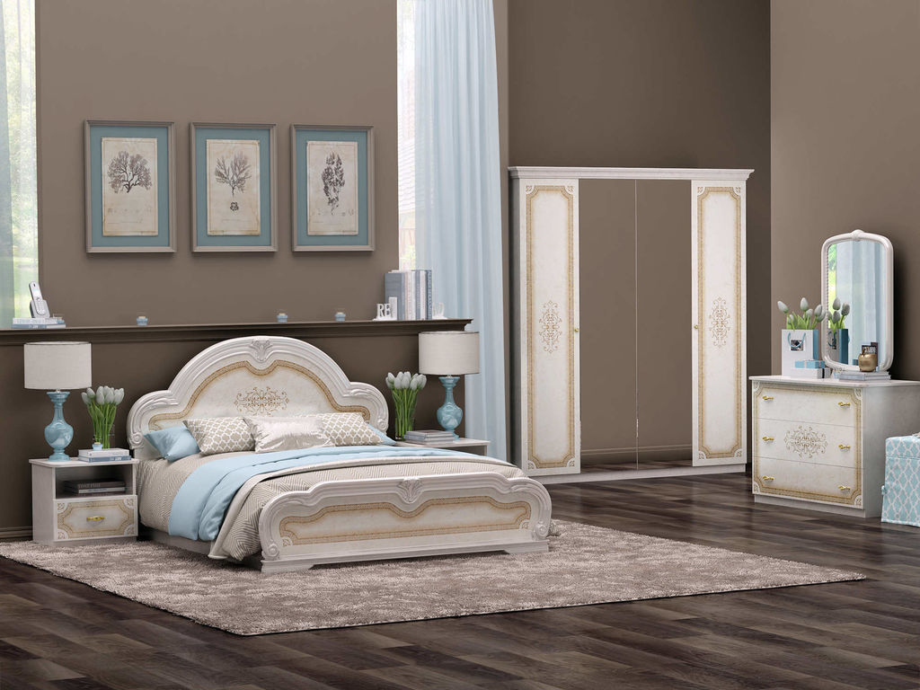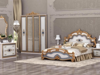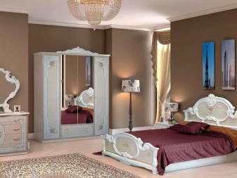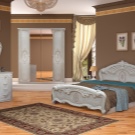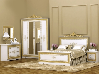 Le lit de luxe est équipé d'une tête de lit haute, les armoires sont présentées dans les versions à 4 et 6 portes. Couronne décorative - un élément inhabituel, inclus dans le kit à la demande du client.