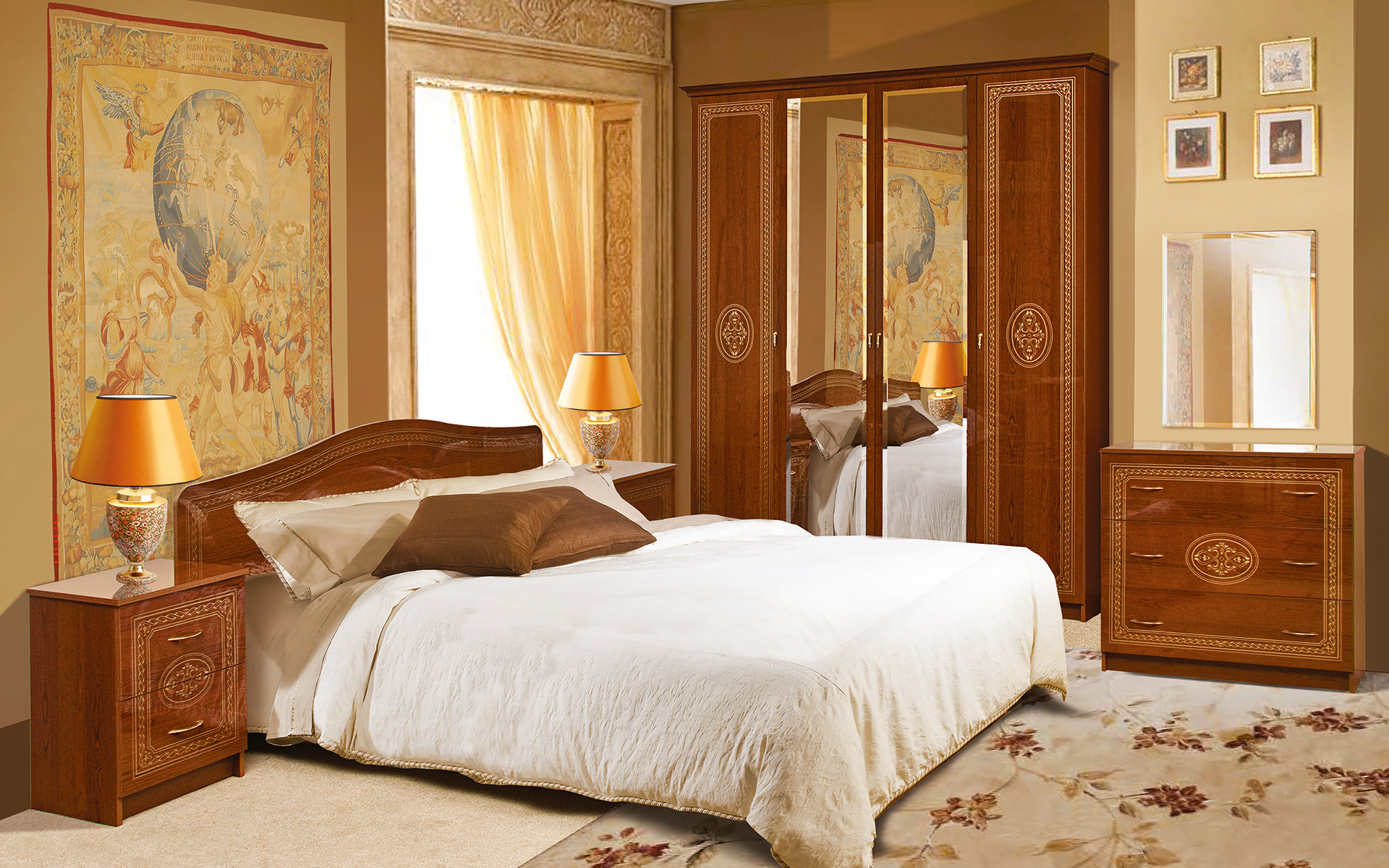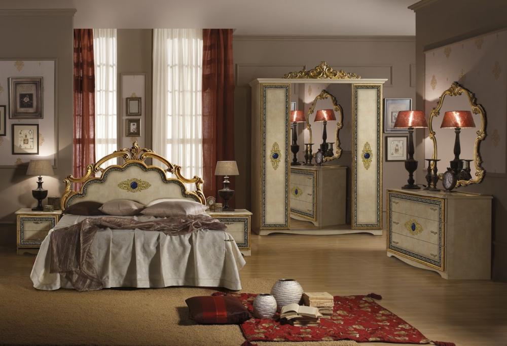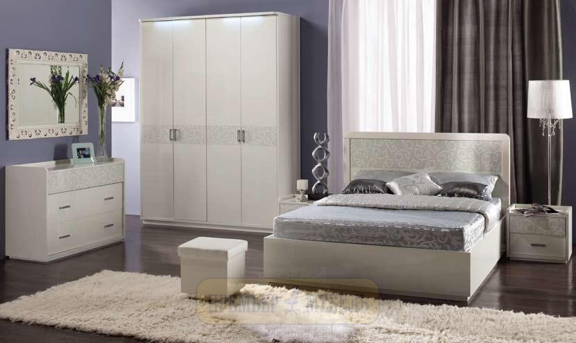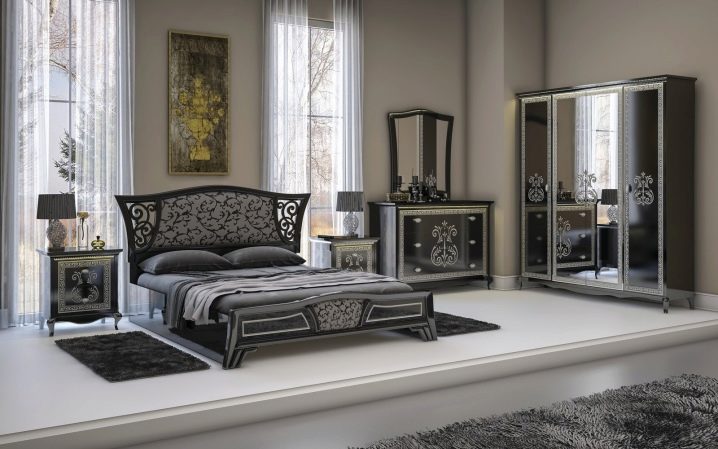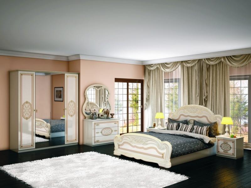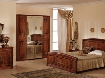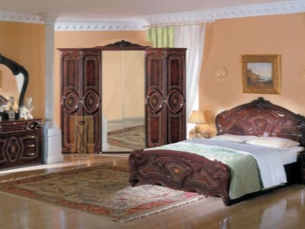Le lit de luxe est équipé d'une tête de lit haute, les armoires sont présentées dans les versions à 4 et 6 portes. Couronne décorative - un élément inhabituel, inclus dans le kit à la demande du client.