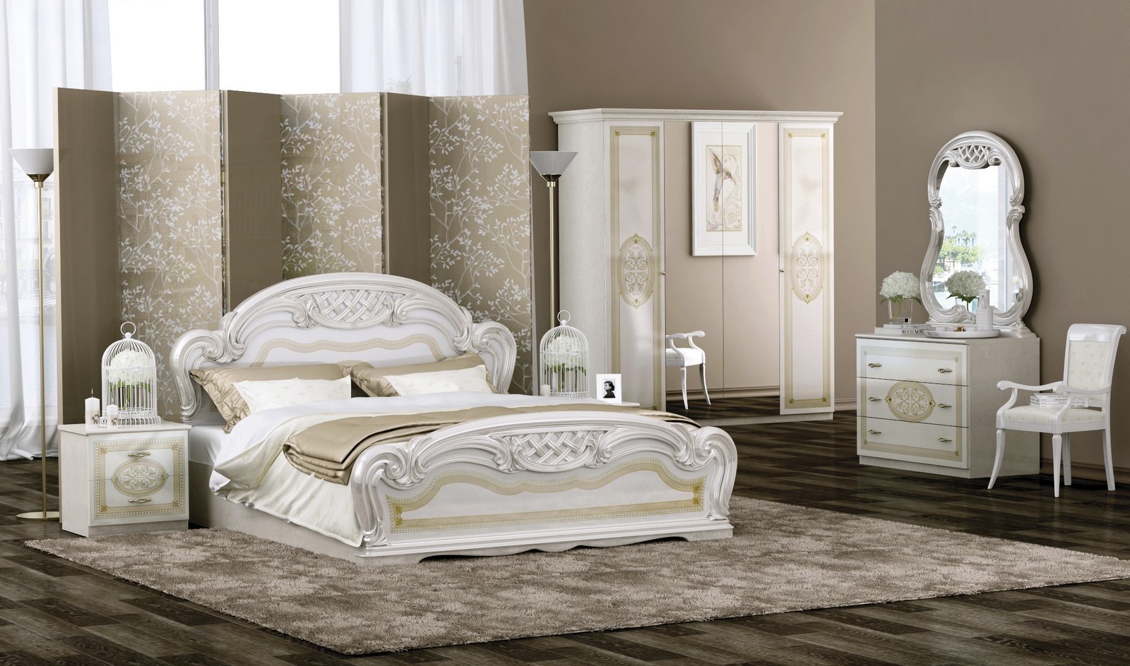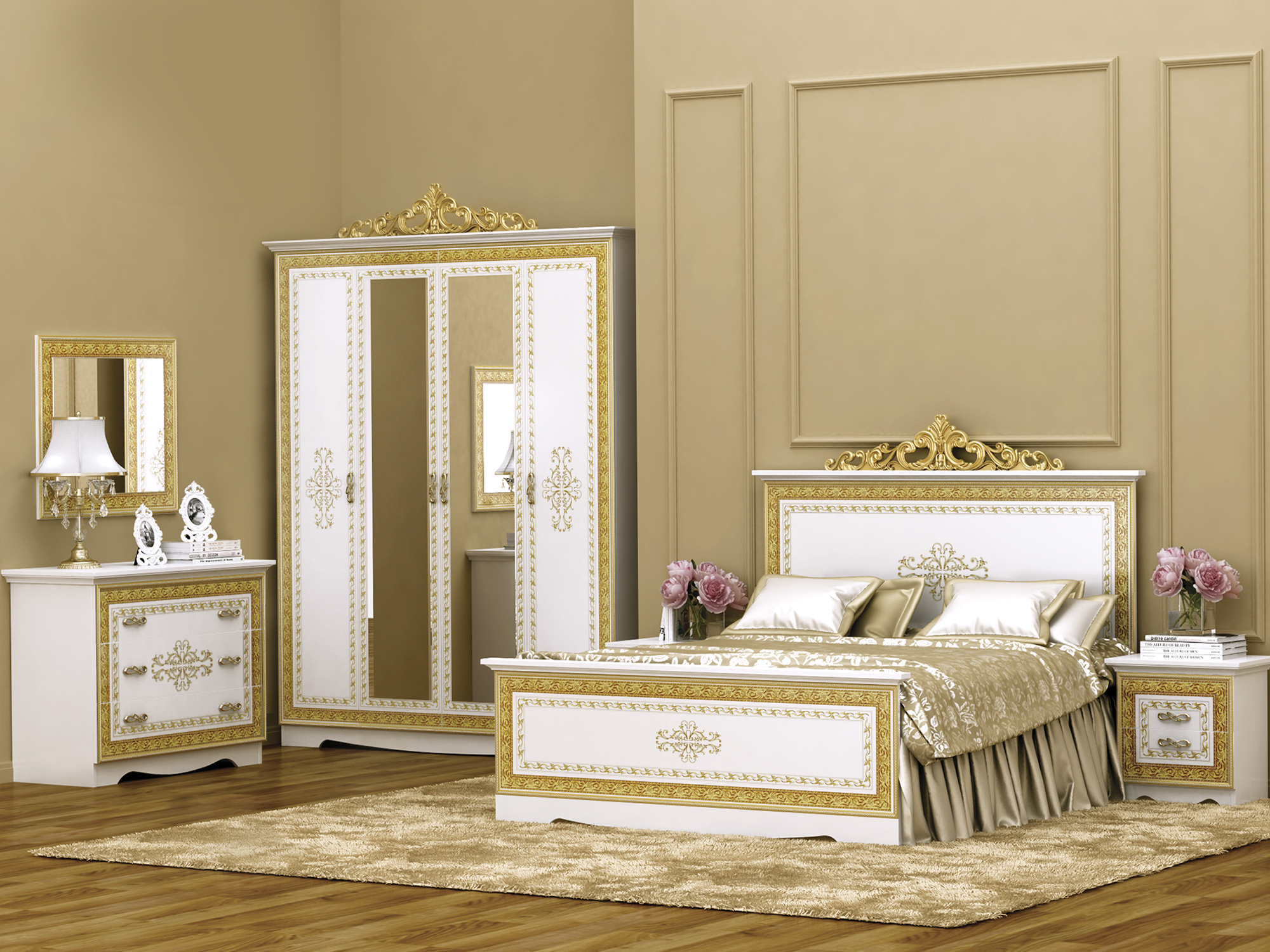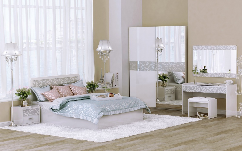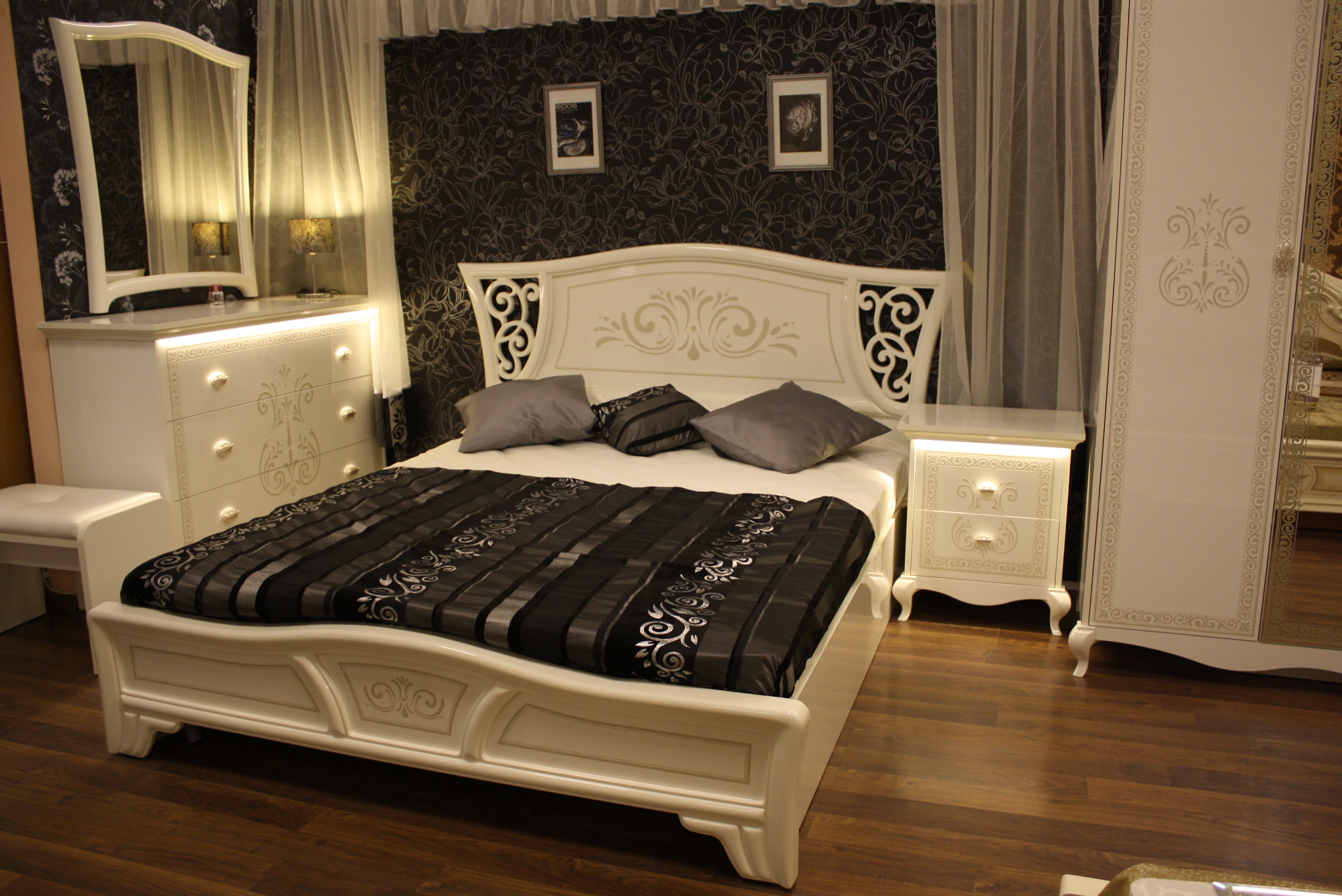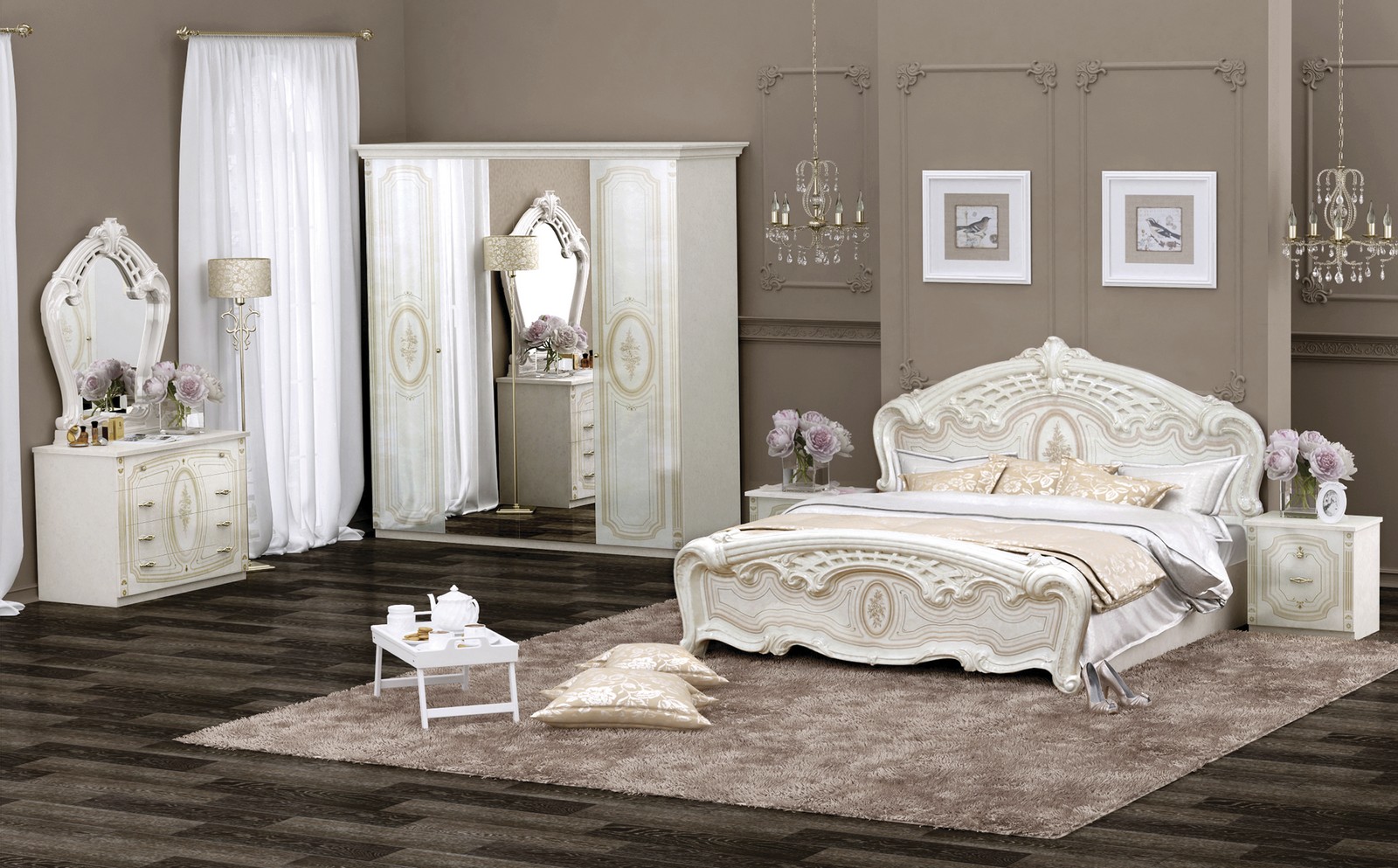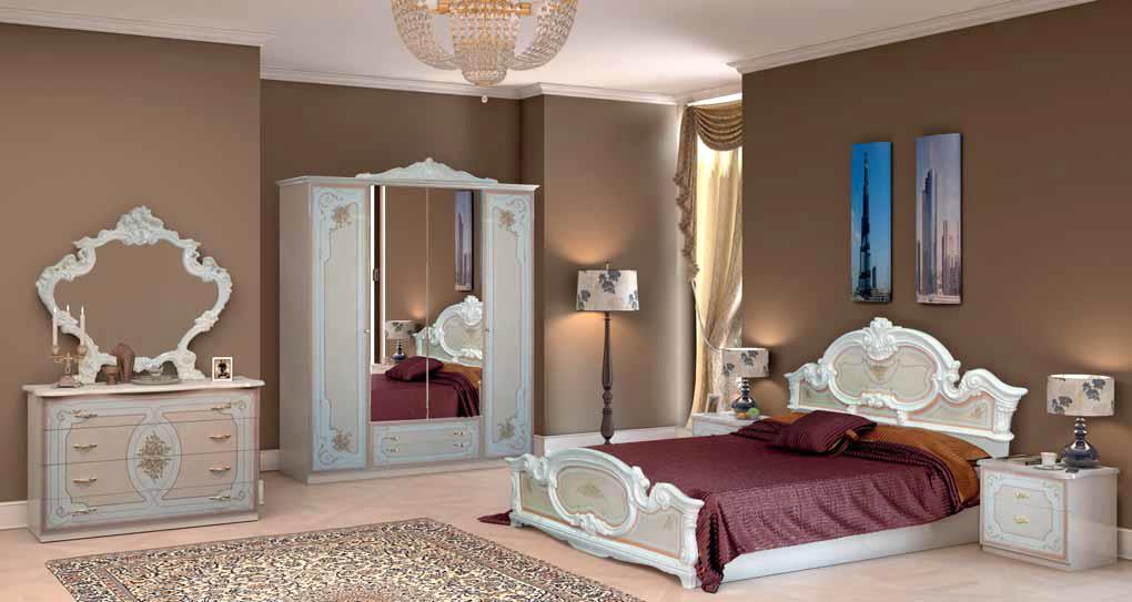 Ce complexe est également fait dans l'esprit des meubles "de palais". Les motifs tridimensionnels ornés et le motif appliqué par la méthode de la sérigraphie donnent à la chambre à coucher de style baroque un charme et une individualité particulière.
