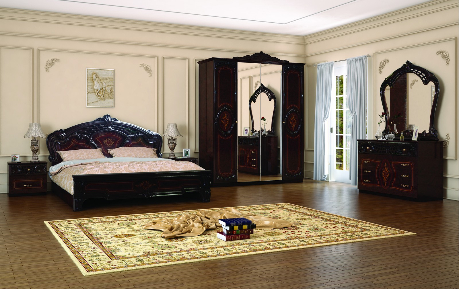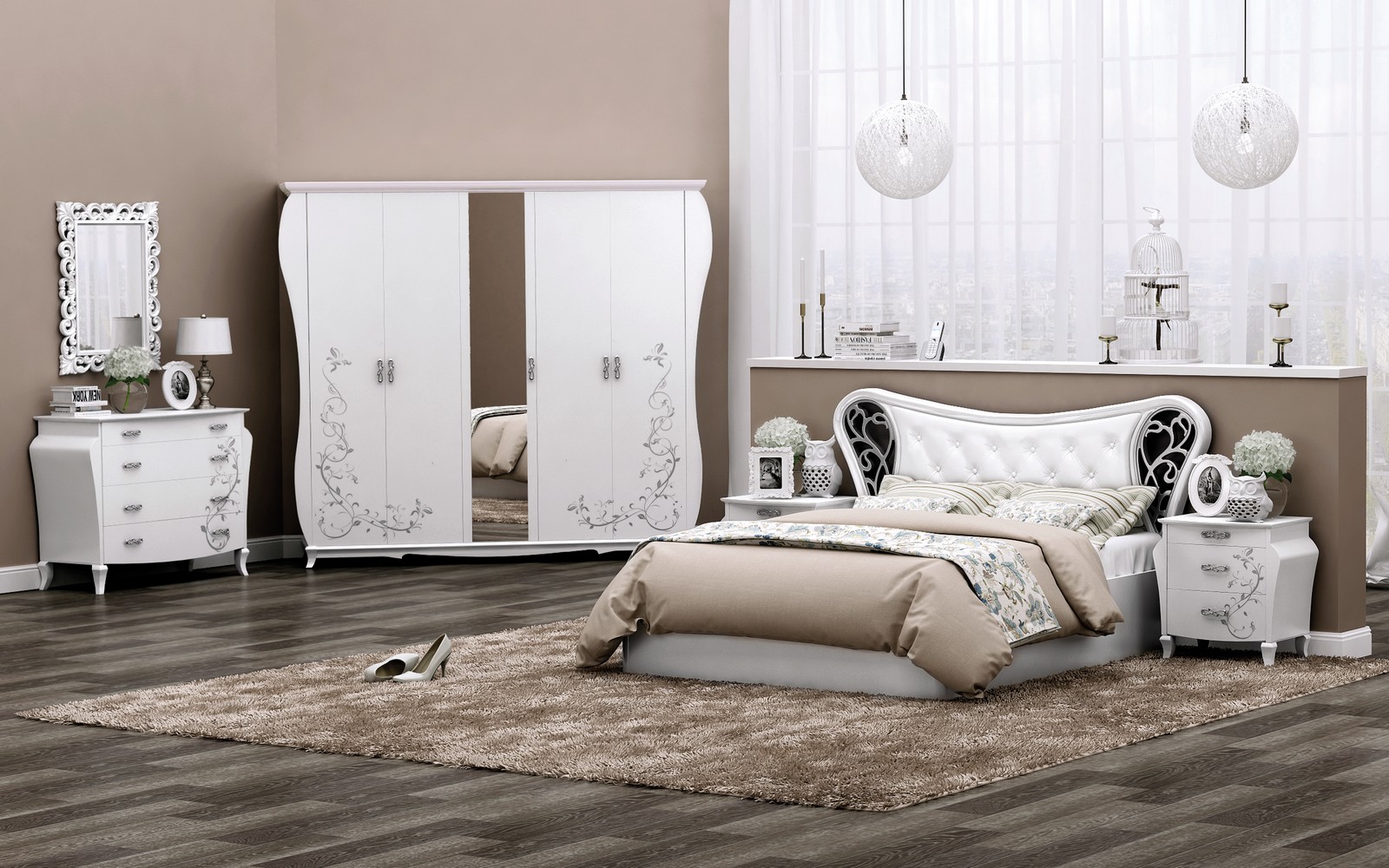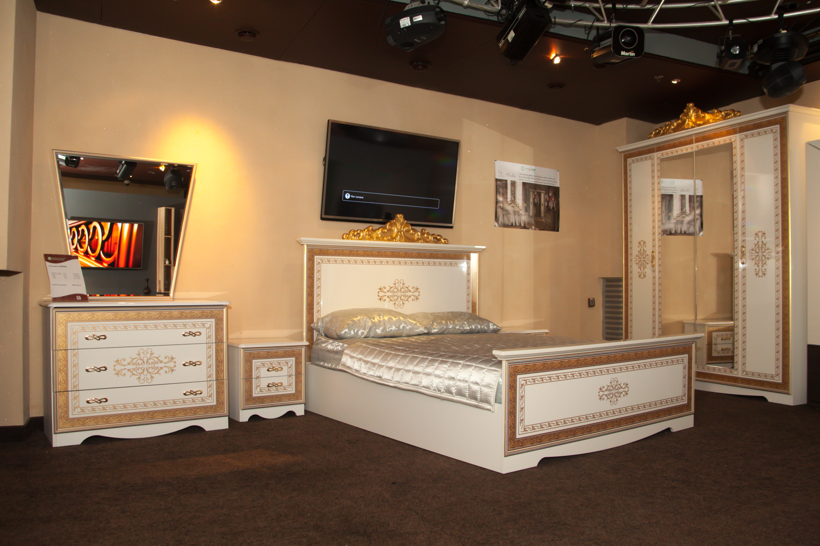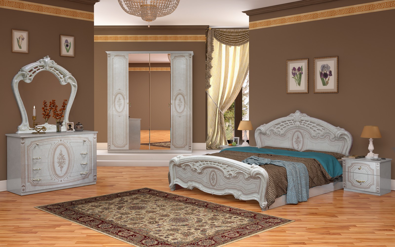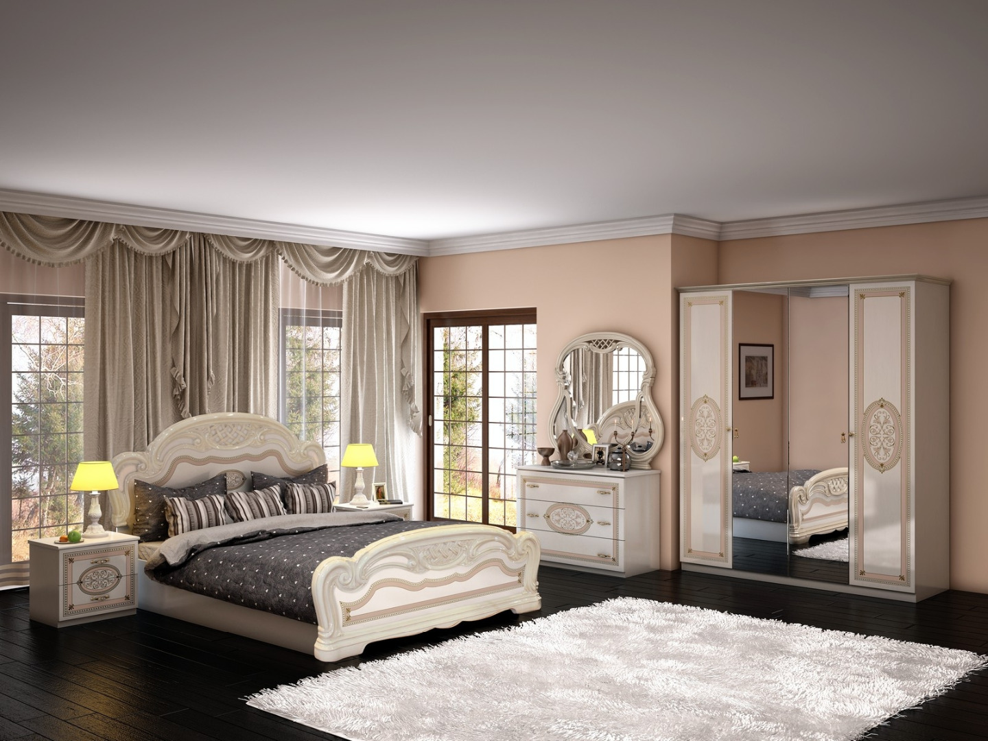 Ce complexe est également fait dans l'esprit des meubles "de palais". Les motifs tridimensionnels ornés et le motif appliqué par la méthode de la sérigraphie donnent à la chambre à coucher de style baroque un charme et une individualité particulière.