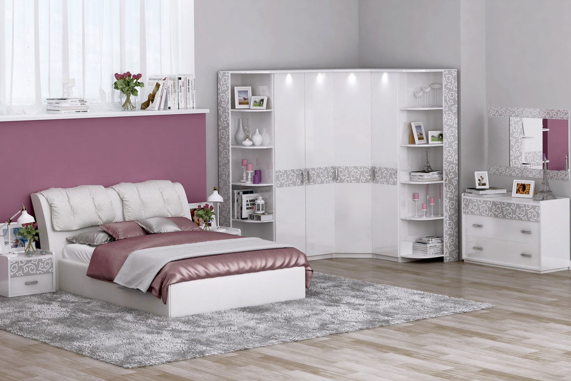 L'armoire, la commode et la table de chevet conquièrent l'élégance des contours et du motif argenté. Des étagères de montage spéciales vous permettent de planifier l'intérieur de l'armoire en fonction de vos préférences personnelles.