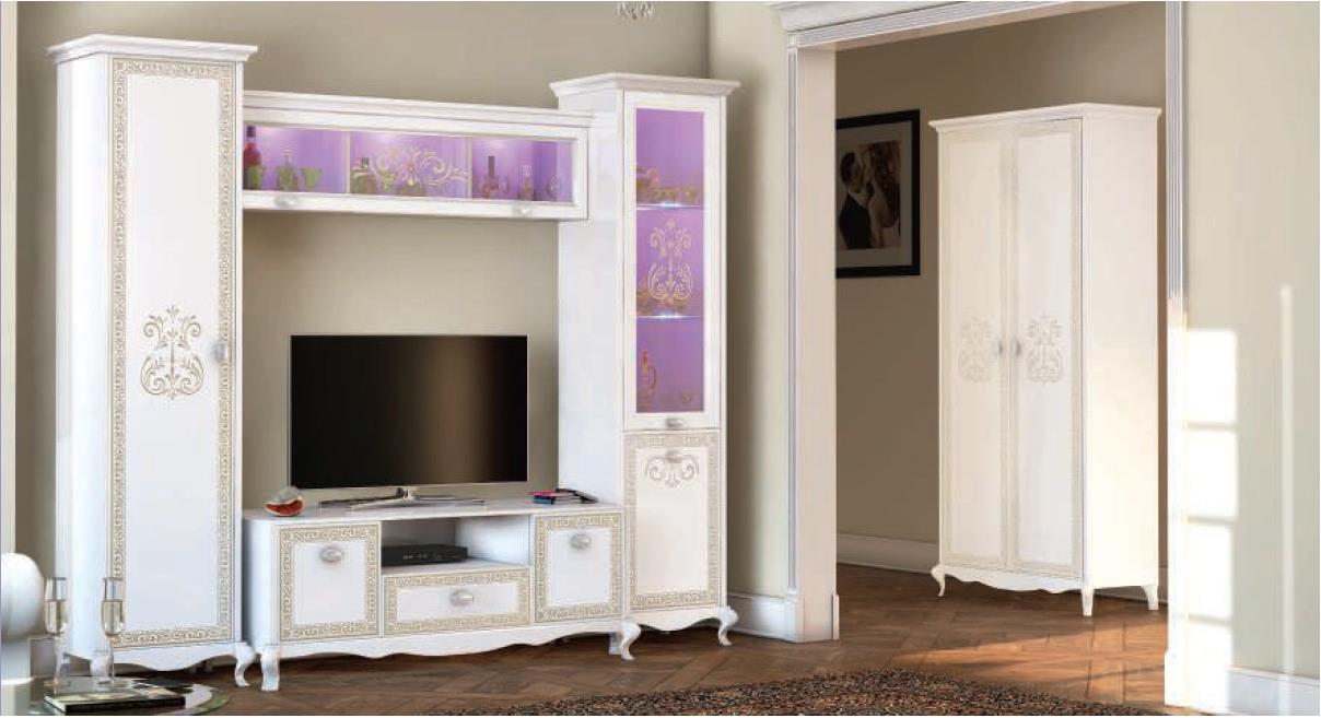 Style classique combiné à la modularité moderne. Les façades brillantes reflètent la lumière et agrandissent visuellement la pièce. L'incrustation de stylos en métal avec des cristaux Swarovski rend la composition encore plus luxueuse.