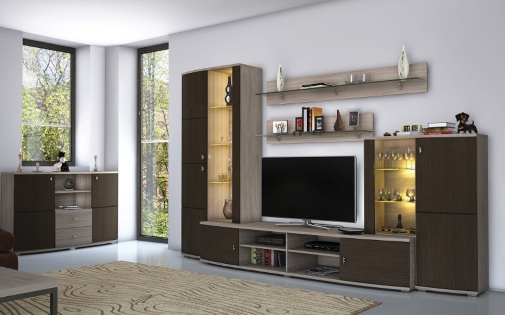 Comme d'habitude, les armoires sont représentées par un système modulaire, ce qui vous permet de choisir l'ensemble qui vous convient le mieux.L'ensemble est présenté dans les tons beige clair et noyer.