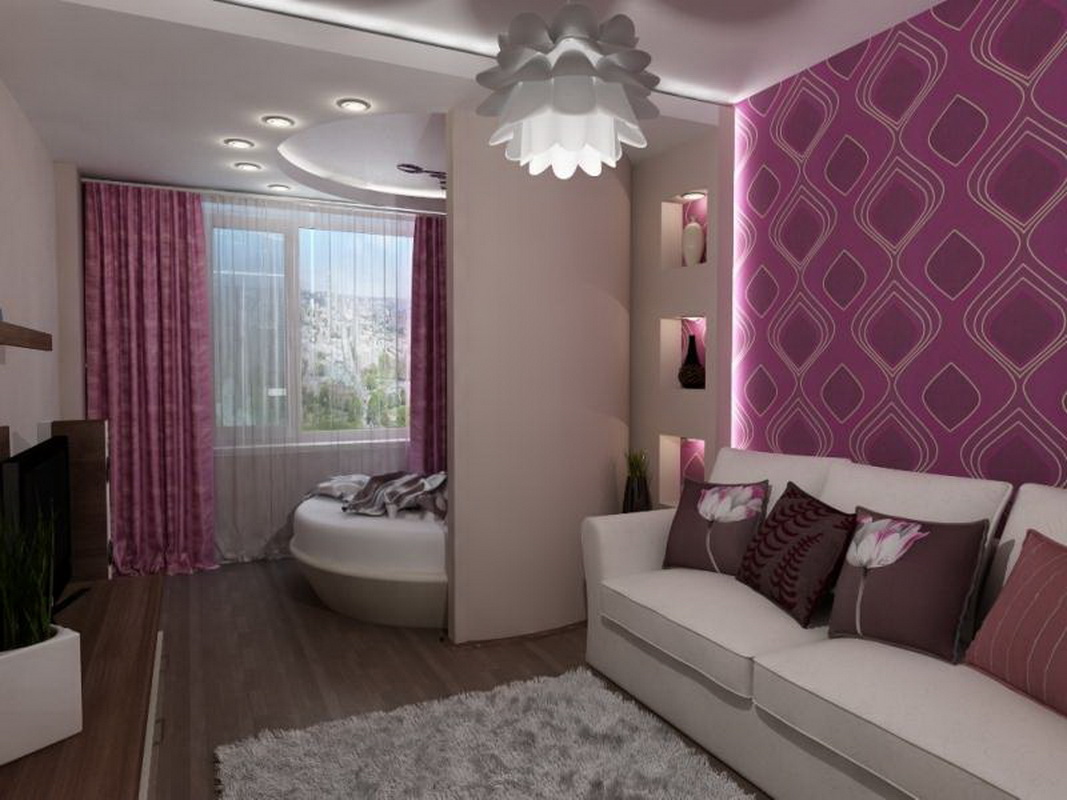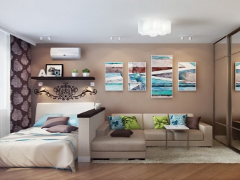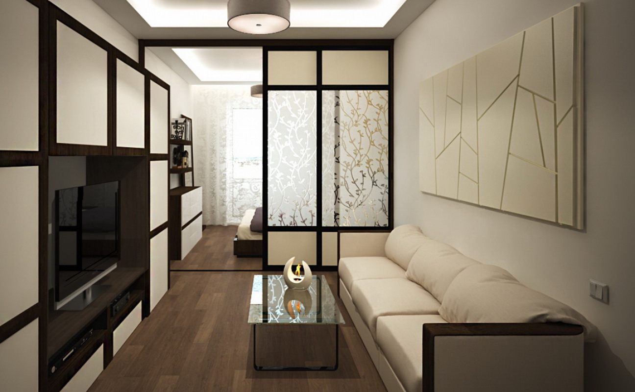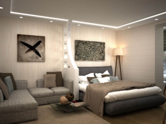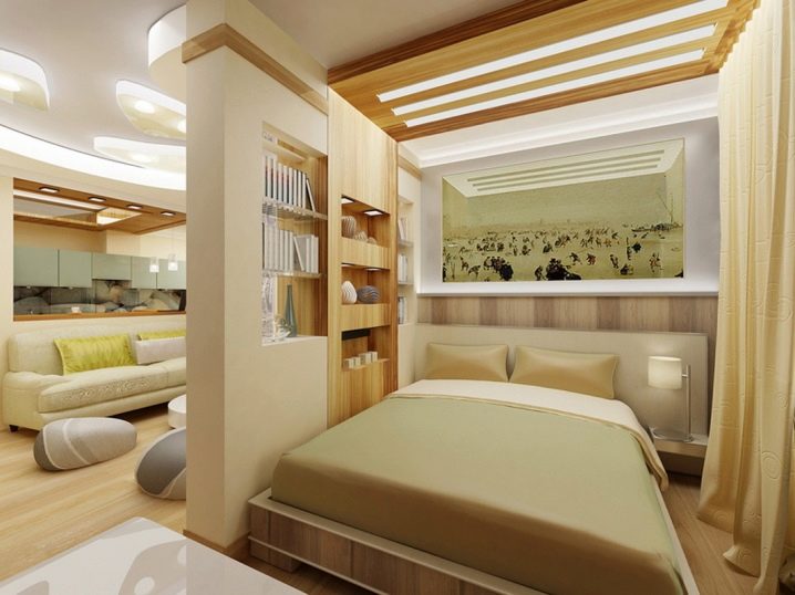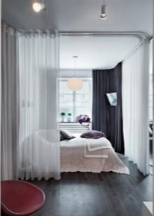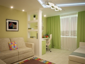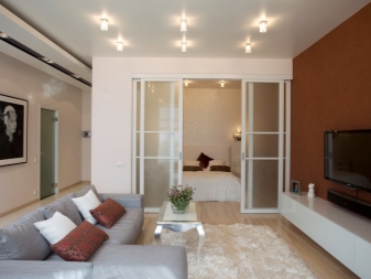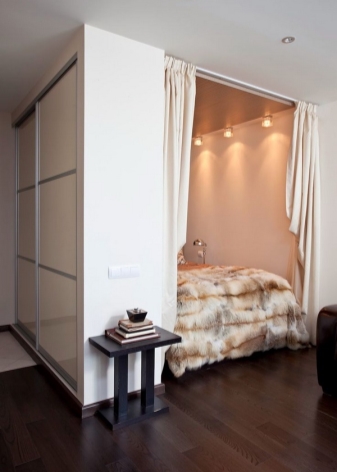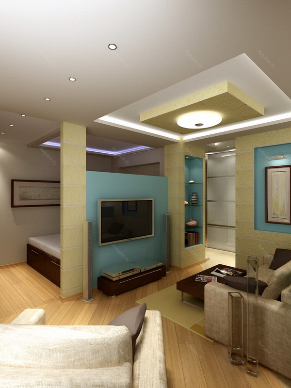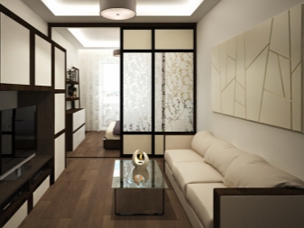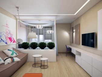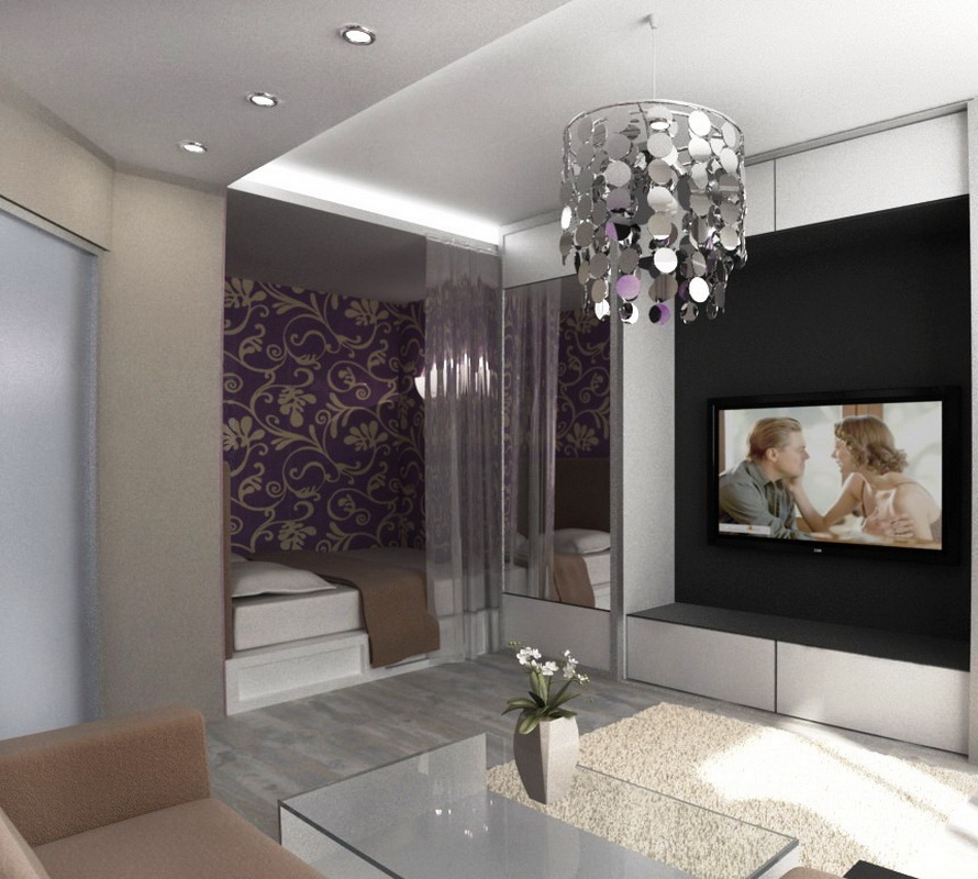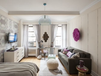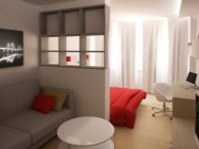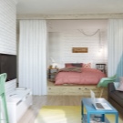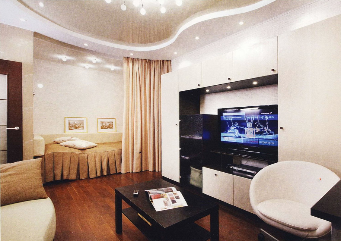 Les concepteurs conseillent donc de maximiser l’utilisation de l’espace pour placer un lit loin de la porte d’entrée du salon. Un coin éloigné avec une couchette, situé sur un petit podium, couvert de rideaux esthétiques, agissant comme un écran ou séparé par une petite cloison en placoplâtre deviendra un lieu isolé dans l'appartement, non encombré de murs inutiles. L'espace principal doit être consacré au salon avec un beau canapé spacieux, une table basse et une télévision, qui, dans certains modes de réalisation, est fixée directement sur la cloison créée avec un espace de couchage.
