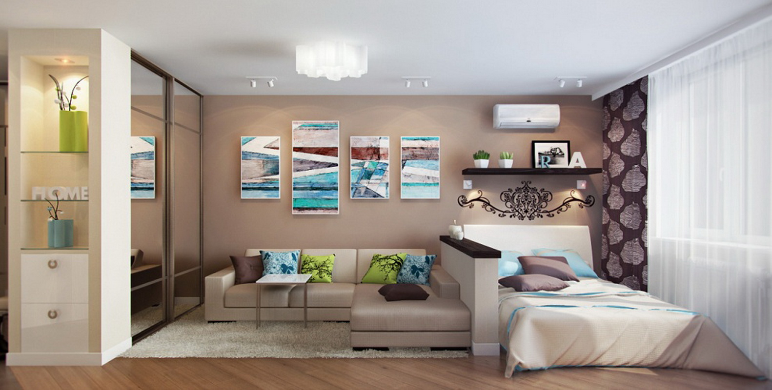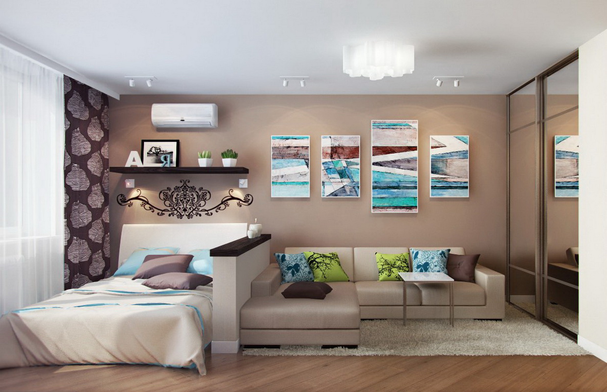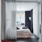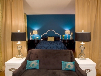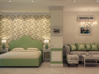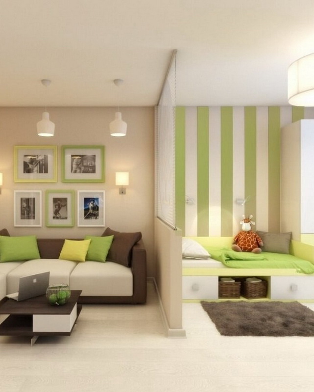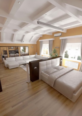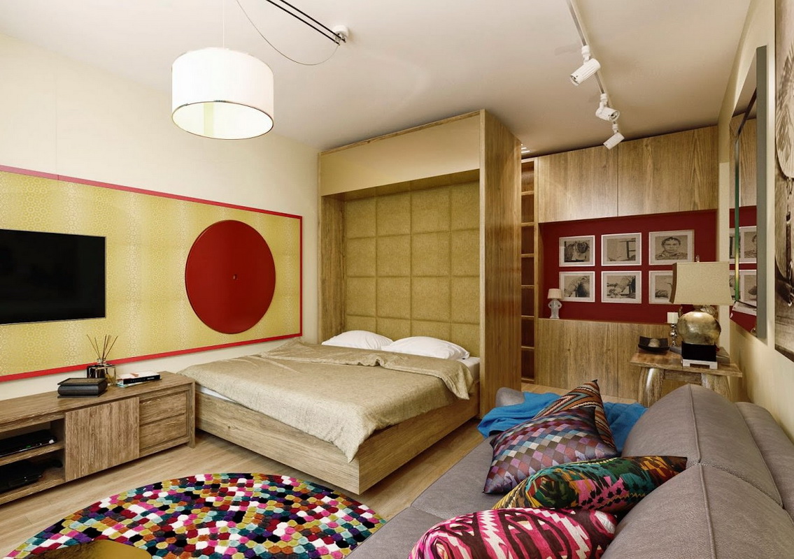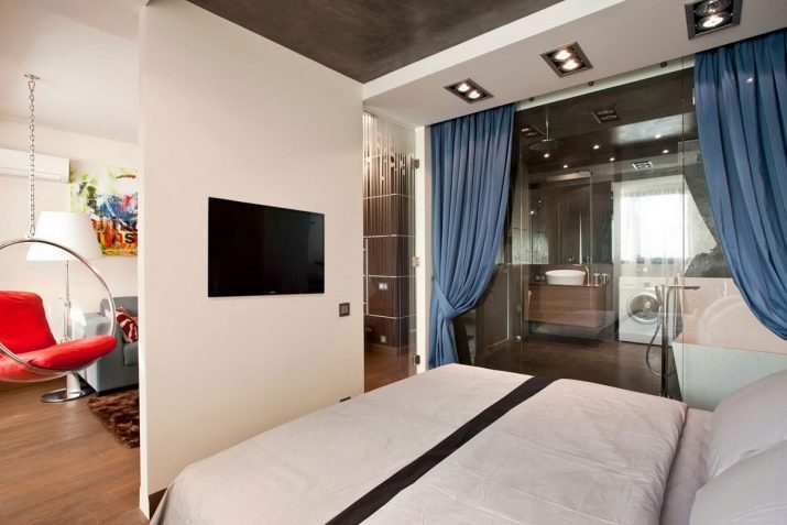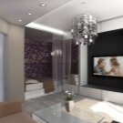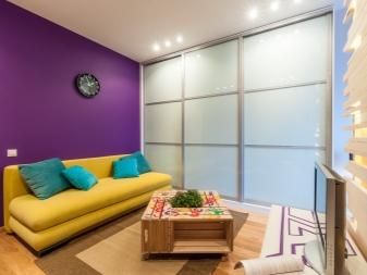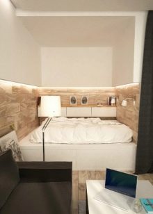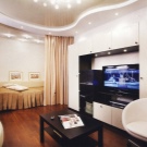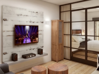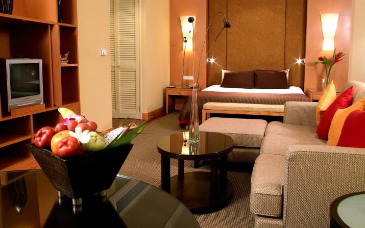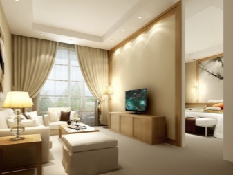 Les concepteurs conseillent donc de maximiser l’utilisation de l’espace pour placer un lit loin de la porte d’entrée du salon. Un coin éloigné avec une couchette, situé sur un petit podium, couvert de rideaux esthétiques, agissant comme un écran ou séparé par une petite cloison en placoplâtre deviendra un lieu isolé dans l'appartement, non encombré de murs inutiles. L'espace principal doit être consacré au salon avec un beau canapé spacieux, une table basse et une télévision, qui, dans certains modes de réalisation, est fixée directement sur la cloison créée avec un espace de couchage.